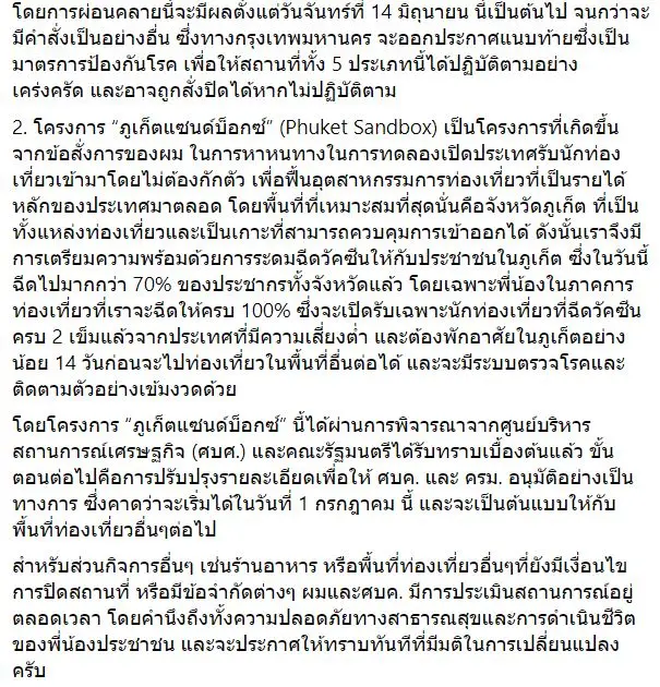 สำหรับส่วนกิจการอื่นๆ เช่นร้านอาหาร หรือพื้นที่ท่องเที่ยวอื่นๆที่ยังมีเงื่อนไขการปิดสถานที่ หรือมีข้อจำกัดต่างๆ ผมและศบค. มีการประเมินสถานการณ์อยู่ตลอดเวลา โดยคำนึงถึงทั้งความปลอดภัยทางสาธารณสุขและการดำเนินชีวิตของพี่น้องประชาชน และจะประกาศให้ทราบทันทีที่มีมติในการเปลี่ยนแปลงครับ