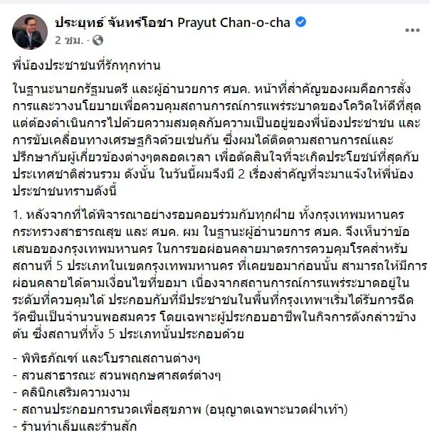 ในฐานะนายกรัฐมนตรี และผู้อำนวยการ ศบค. หน้าที่สำคัญของผมคือการสั่งการและวางนโยบายเพื่อควบคุมสถานการณ์การแพร่ระบาดของโควิดให้ดีที่สุด แต่ต้องดำเนินการไปด้วยความสมดุลกับความเป็นอยู่ของพี่น้องประชาชน และการขับเคลื่อนทางเศรษฐกิจด้วยเช่นกัน ซึ่งผมได้ติดตามสถานการณ์และปรึกษากับผู้เกี่ยวข้องต่างๆตลอดเวลา เพื่อตัดสินใจที่จะเกิดประโยชน์ที่สุดกับประเทศชาติส่วนรวม ดังนั้น ในวันนี้ผมจึงมี 2 เรื่องสำคัญที่จะมาแจ้งให้พี่น้องประชาชนทราบดังนี้