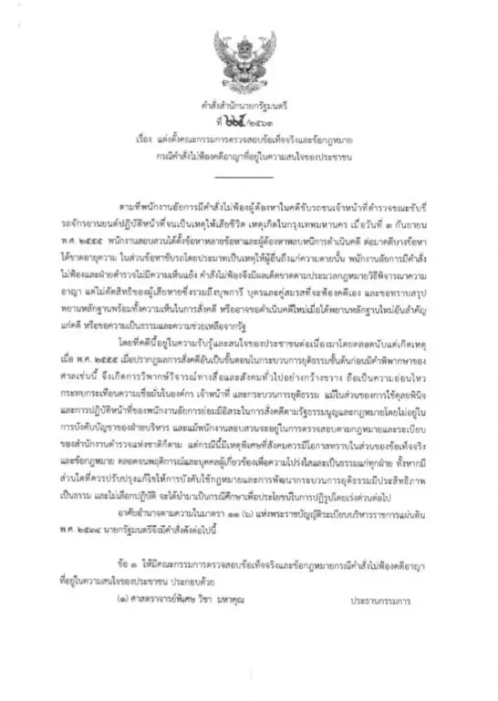 โดยคณะกรรมการชุดดังกล่าวมีอำนาจหน้าที่ตรวจสอบข้อเท็จจริงและข้อกฎหมาย เสนอแนะแนวทางเพื่อนำไปสู่การปรับปรุงแก้ไขกฎหมายหรือวิธีปฏิบัติของเจ้าหน้าที่ เพื่อประโยชน์ในการพัฒนาองค์ความรู้ การปฏิบัติหน้าที่ และการปฏิรูปกระบวนการยุติธรรม โดยไม่ก้าวล่วงอำนาจและหน้าที่ของเจ้าหน้าที่ในคดีดังกล่าว แล้วรายงานนายกรัฐมนตรีภายใน30วัน นับตั้งแต่คำสั่งมีผลใช้บังคับ หากนายกฯ เห็นว่าข้อเสนอแนะในการปฏิรูปยังไม่แล้วเสร็จ อาจให้ขยายระยะเวลาอีกได้