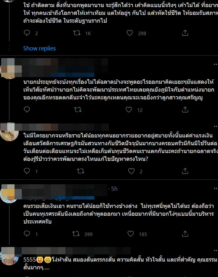 ขณะเดียวกันก็มีบางความเห็นที่วิจารณ์อย่างรุนแรงแรงว่าพล.อ.ประยุทธ์ไม่มีวิสัยทัศน์ในการบริหารและแก้ปัญหาความไม่เท่าเทียมในประเทศ และสิ่งที่พล.อ.ประยุทธ์พูดมานั้น ยิ่งเป็นการตอกย้ำปัญหาเรื่องความเหลื่อมล้ำ และการแบ่งชนชั้นในไทยด้วย