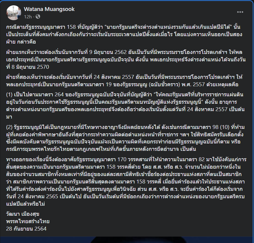 นาย วัฒนา เมืองสุข สมาชิกพรรคไทยสร้างไทย ได้โพสต์เฟซบุ๊ก เมื่อวันที่ 28 ก.ย. 2564 สนับสนุนแนวคิดเรื่องการยื่นศาลรัฐธรรมนูญ ตีความกรณีพล.อ.ประยุทธ์ จันทร์โอชา อยู่ในตำแหน่งนายกรัฐมนตรีนาน 8 ปี โดยระบุว่า