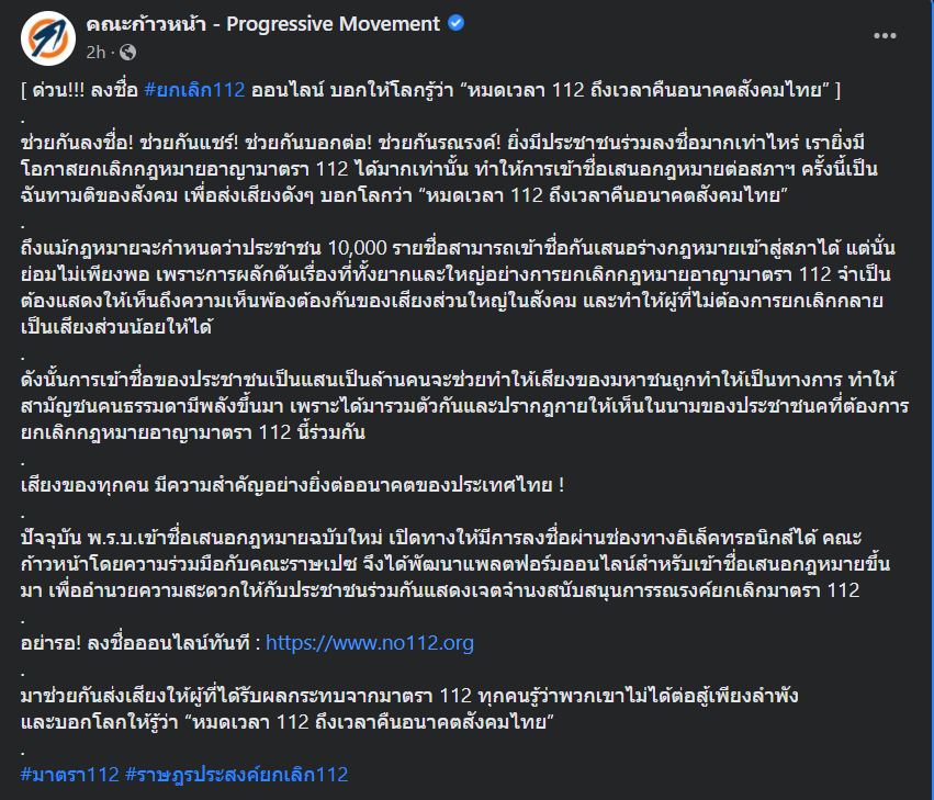 เมื่อวันที่ 5 พ.ย. 2564 เฟซบุ๊กคณะก้าวหน้าได้โพสต์ข้อความ ผ่านทางเฟซบุ๊ก เชิญชวนให้ประชาชนร่วมลงชื่อ ยกเลิกม.112 หรือมาตรา 112 โดยมีเนื้อหาระบุว่า