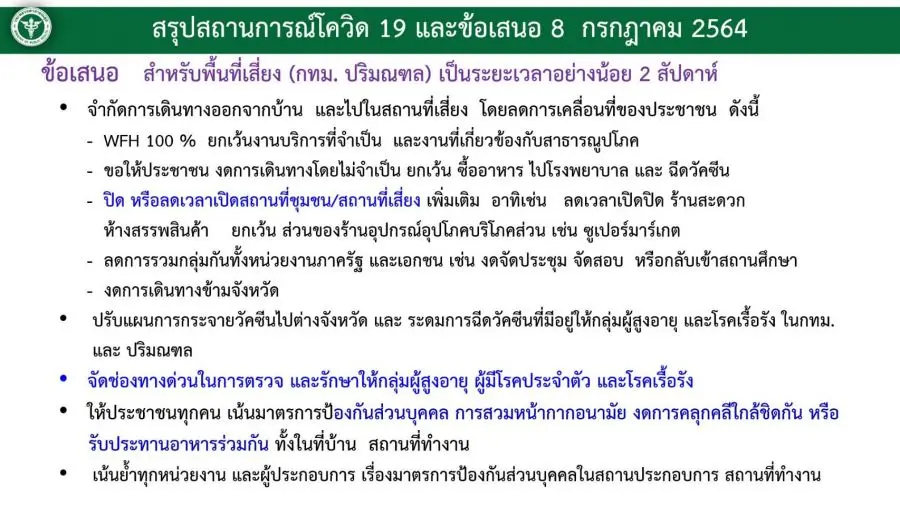 -งดการเดินทางโดยไม่จำเป็น ยกเว้น ซื้ออาหาร ไปโรงพยาบาล และ ฉีดวัคซีน
