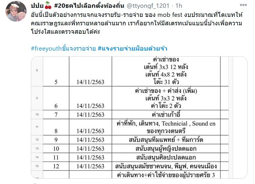 ทั้งนี้ชาวโซเชียลที่มีส่วนร่วมโอนเงินสมทบเป็นท่อน้ำเลี้ยงยังมองว่าแพยางยูนิคอร์นและเอเลี่ยนที่นำมาแสดงออกเชิงสัญลักษณ์ในการชุมนุมวันนี้นั้นเป็นการใช้เงินไปโดยเปล่าประโยชน์ ไม่สามารถป้องกันอันตรายทั้งจากการรับมือจากเจ้าหน้าที่รัฐและมือที่ 3 ได้จริง และพบว่าลูกโป่งยางเอเลี่ยนนั้นมีมูลค่าสูงถึงตัวละ 20,000 บาท จึงร่วมกันติดแฮชแท็ก #แจงรายจ่ายม็อบด้วยจ้า ติดเทรนด์ทวิตเตอร์ประเทศไทย