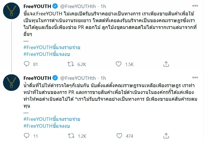 ล่าสุด เยาวชนปลดแอกได้ออกมาชี้แจงกรณีดังกล่าวผ่านทวิตเตอร์ระบุว่า “FreeYOUTH ไม่เคยเปิดรับบริจาคอย่างเป็นทางการ เราเพียงขายสินค้าเพื่อใช้เป็นทุนในการดำเนินงานระยะยาว โพสต์ที่เคยลงรับบริจาคเป็นของคณะราษฎรซึ่งเราไม่ได้ดูแลเรื่องนี้เพียงช่วย PR ดอกไม้ ลูกโป่งชุดมาสคอสไม่ได้มาจากเราแต่มาจากที่อื่นๆ