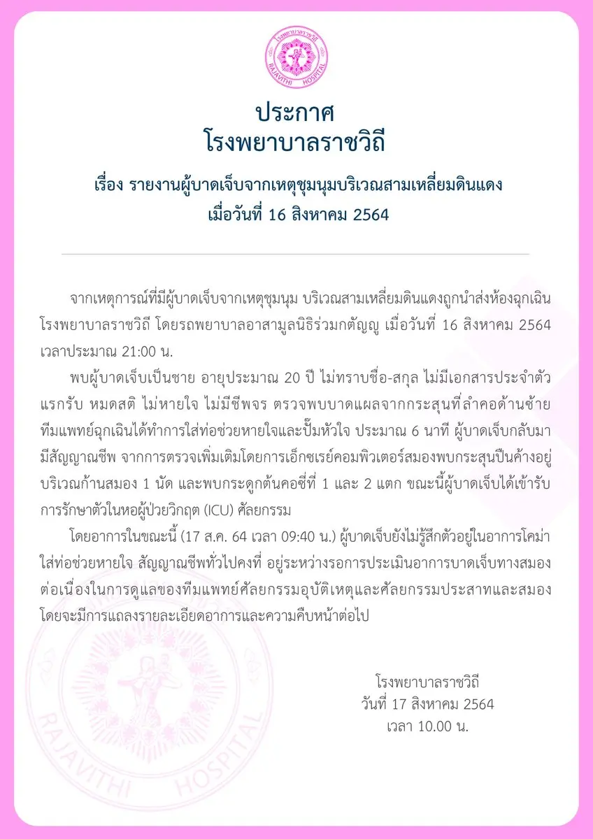 เมื่อวันที่ 17 ส.ค.2564 โรงพยาบาลราชวิถีได้ออกแถลงการณ์ เรื่องรายงานผู้บาดเจ็บจากเหตุ ผู้ชุมนุมถูกยิง บริเวณสามเหลี่ยมดินแดง เมื่อ16 ส.ค.2564 เมื่อเวลา 21.00 น.โดยระบุว่า