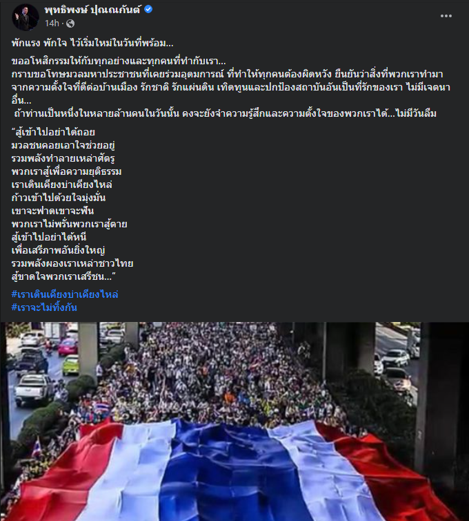 กราบขอโทษมวลมหาประชาชนที่เคยร่วมอุดมการณ์ ที่ทำให้ทุกคนต้องผิดหวัง ยืนยันว่าสิ่งที่พวกเราทำมาจากความตั้งใจที่ดีต่อบ้านเมือง รักชาติ รักแผ่นดิน เทิดทูนและปกป้องสถาบันอันเป็นที่รักของเรา ไม่มีเจตนาอื่น…
