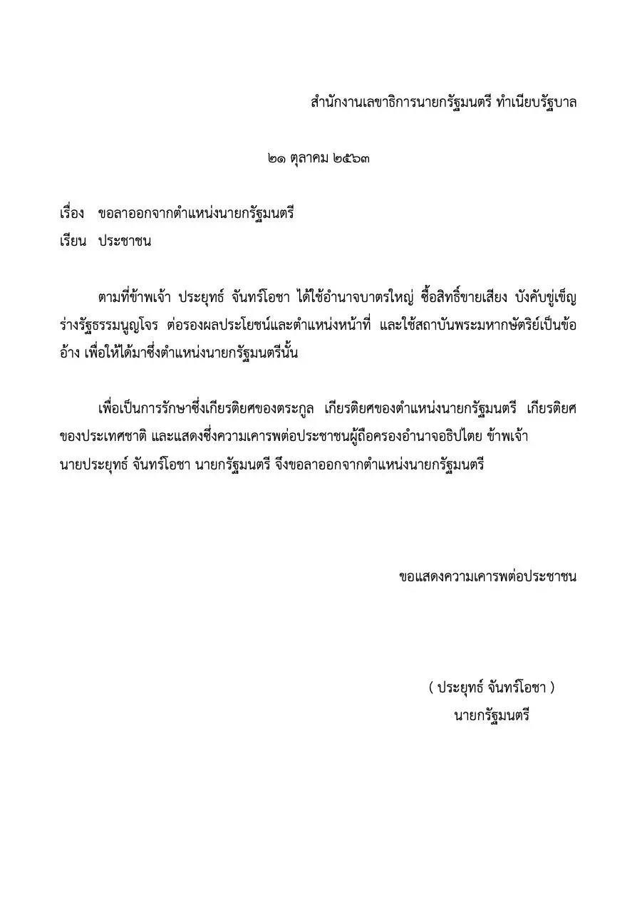 คำกล่าวว่าต้องการถอยของประยุทธ์จะไม่เป็นจริง หากประยุทธ์ไม่ลาออกในตอนนี้ เราซึ่งเป็นราษฎรจึงขอยื่นคำขาดว่า “ประยุทธ์จะต้องลาออกจากการเป็นนายกรัฐมนตรีเดี๋ยวนี้! ทันที!” หากไม่มีการลาออกภายใน 3 วัน “ราษฎรจะกลับมา”