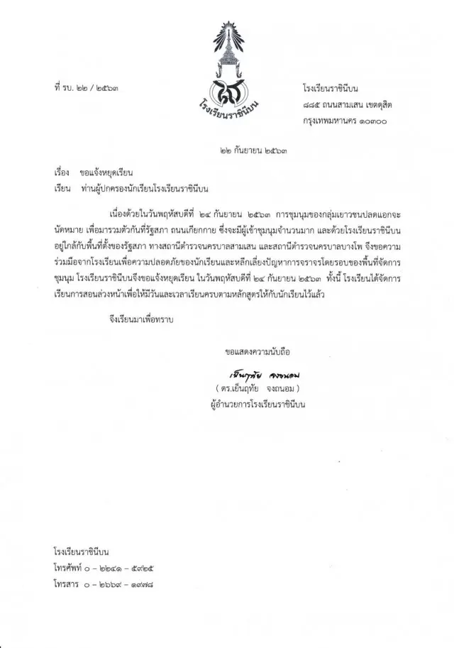 ทางสถานีตำรวจนครบาลสามเสน และสถานีตำรวจนครบาลบางโพ จึงขอความร่วมมือจากโรงเรียน เพื่อความปลอดภัยของนักเรียน และหลีกเลี่ยงปัญหาการจราจรโดยรอบของพื้นที่จัดการชุมนุม ดังนั้น ทางโรงเรียนราชินี จึงขอแจ้งหยุดเรียน ในวันพฤหัสบดีที่ 24 กันยายน 2563 ทั้งนี้ โรงเรียนจะได้จัดการเรียนการสอนล่วงหน้า เพื่อให้มีวันและเวลาเรียนครบตามหลักสูตรให้กับนักเรียนเอาไว้แล้ว จึงเรียนมาเพื่อทราบ
