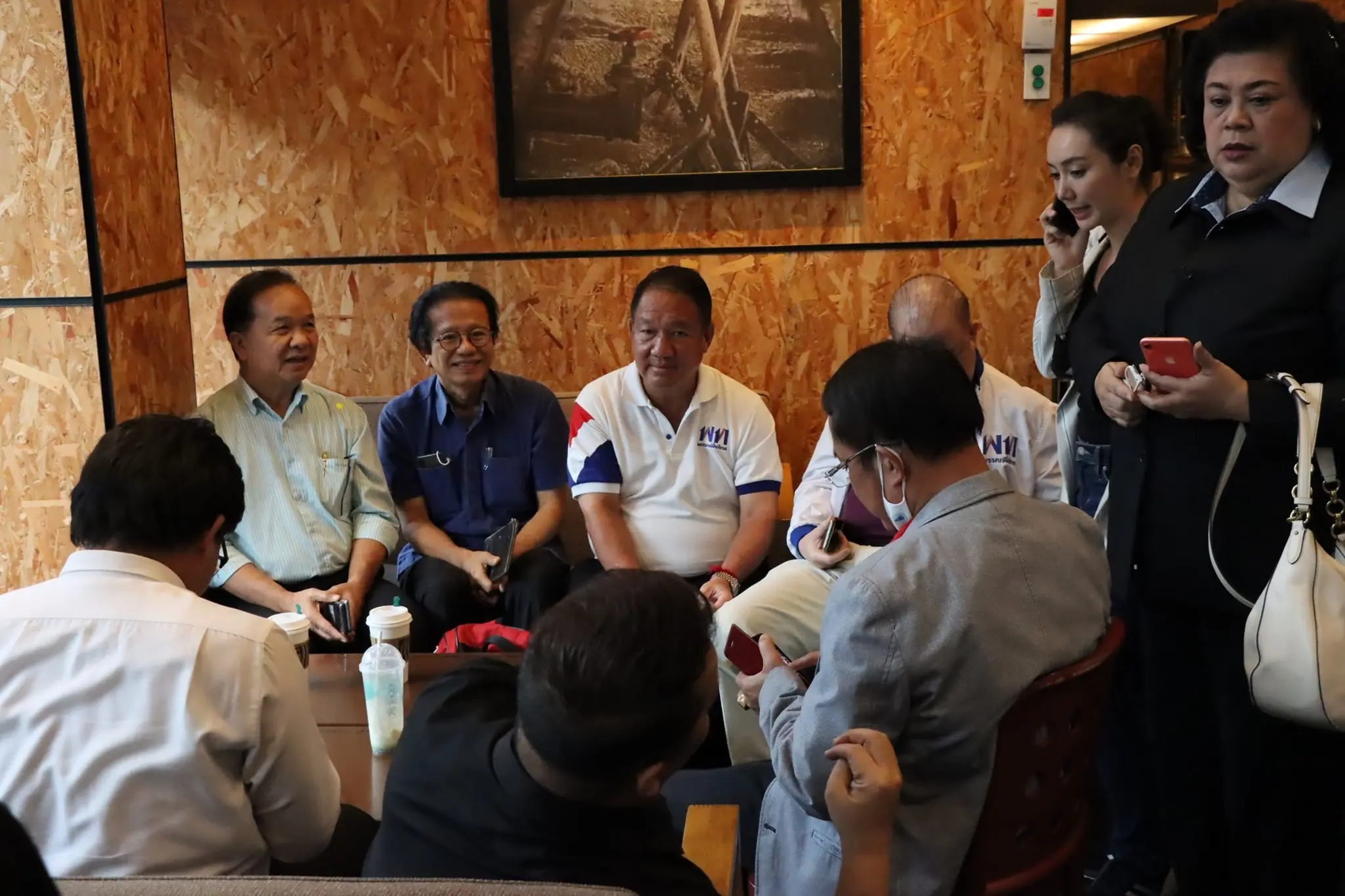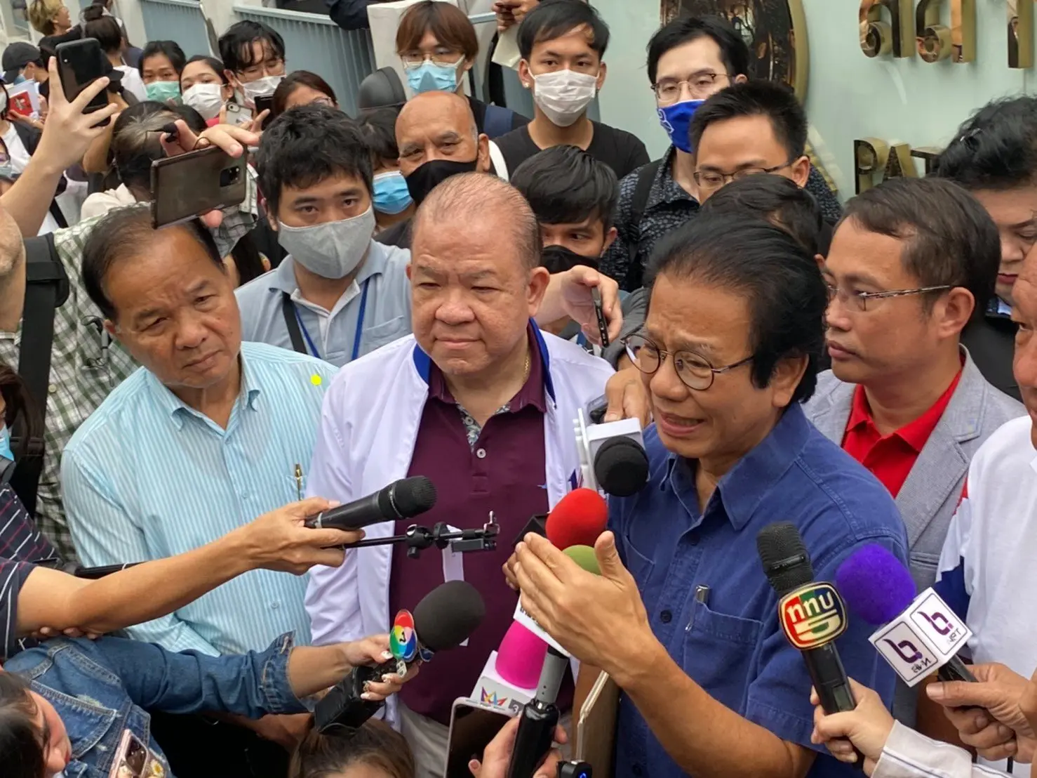 ม็อบ18ต.ค. พรรคเพื่อไทย นำโดย นายประเสริฐ จันทรรวงทอง เลขาธิการพรรค พร้อมด้วย นายกิตติรัตน์ ณ ระนอง นายพิชัย นริพทะพันธุ์ นายอนุสรณ์ เอี่ยมสะอาด รองหัวหน้าพรรค ดร.ธีรรัตน์ สำเร็จวาณิชย์ เหรัญญิกพรรค ผศ.ดร.อรุณี กาสยานนท์ โฆษกพรรค นายสมคิด เชื้อคง เดินทางมาให้กำลังใจ นพ.ทศพร เสรีรักษ์ ที่มารายงานตัวที่ สน.ปทุมวัน หลังจากถูกออกหมายจับ