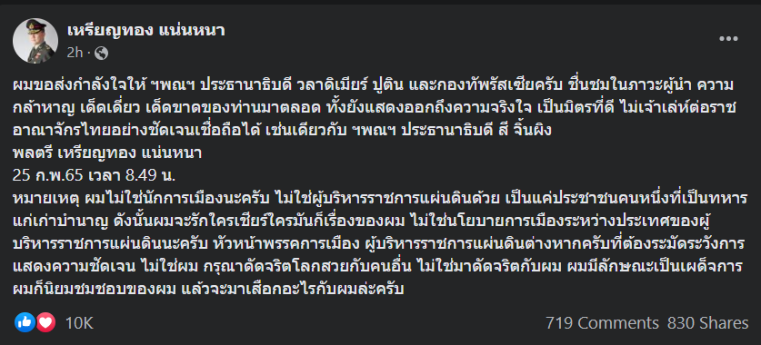 “ผมขอส่งกำลังใจให้ ฯพณฯ ประธานาธิบดี วลาดิเมียร์ ปูติน และกองทัพรัสเซียครับ ชื่นชมในภาวะผู้นำ ความกล้าหาญ เด็ดเดี่ยว เด็ดขาดของท่านมาตลอด ทั้งยังแสดงออกถึงความจริงใจ เป็นมิตรที่ดี ไม่เจ้าเล่ห์ต่อราชอาณาจักรไทยอย่างชัดเจนเชื่อถือได้ เช่นเดียวกับ ฯพณฯ ประธานาธิบดี สี จิ้นผิง