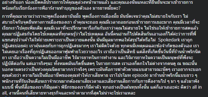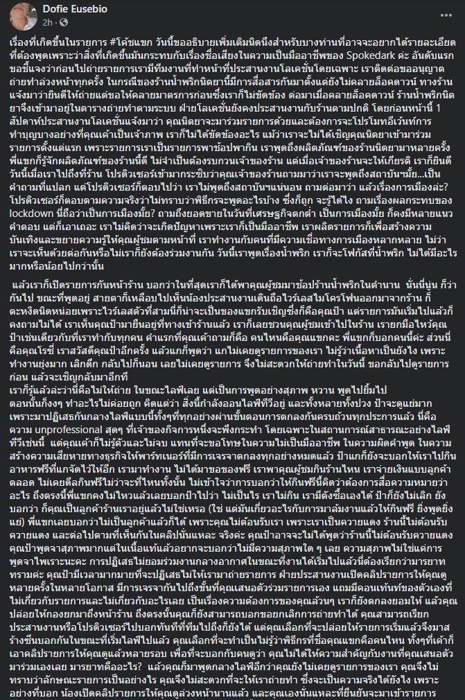 Spokedark เราถูกปฏิเสธบ่อยค่ะ เราคุ้นเคยกับการถูกปฏิเสธมากๆ เราไม่ติดใจด้วย ทุกคนมีเหตุผลและข้อจำกัดของตัวเอง เราไม่เคยเอาเรื่องที่ถูกปฏิเสธออกมาฟูมฟายโวยวายอะไร เราถือว่าเป็นสิทธิ แต่สิ่งที่เกิดขึ้นวันนี้ที่ร้านน้ำพริก เราถือว่าเป็นความไม่เป็นมืออาชีพ ไร้มารยาทในการทำงาน และไร้มารยาทในความเป็นมนุษย์ที่พึงจะปฏิบัติต่อกัน แต่เอาจริงๆนะ ทั้งหมดมันเกิดขึ้นสดๆ ในรายการสด เราเองก็ตกใจไม่ต่างจากคนดู