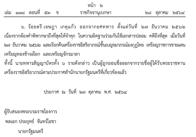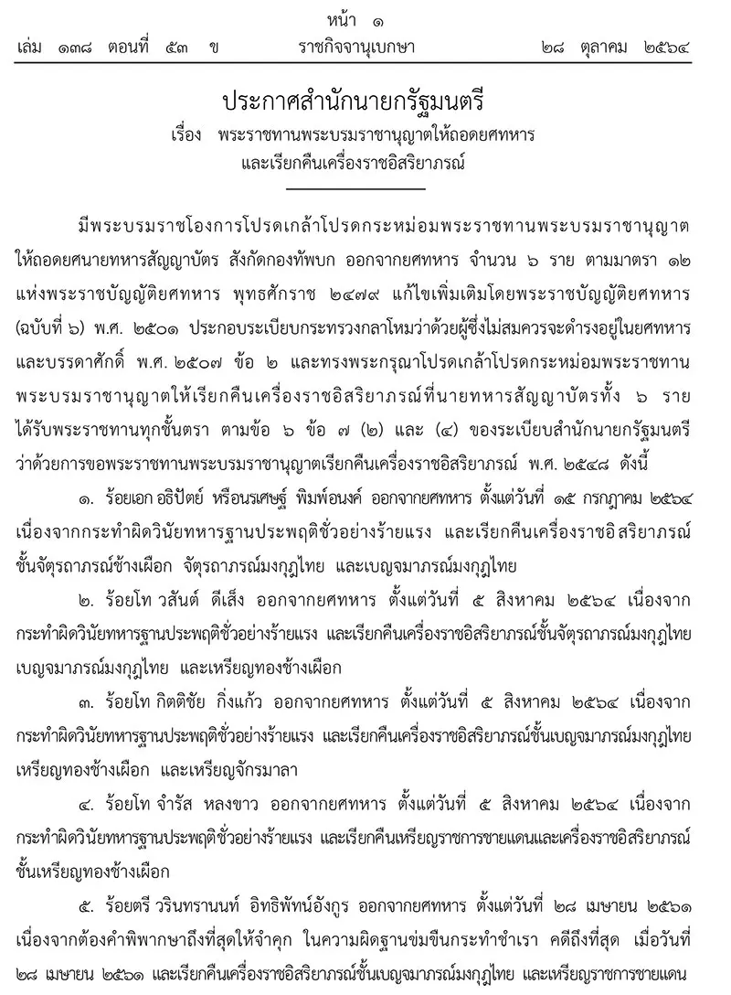 เมื่อวันที่ 28 ต.ค.2564 เว็บไซต์ราชกิจจานุเบกษา เผยแพร่ประกาศสำนักนายกรัฐมนตรีเรื่อง พระราชทานพระบรมราชานุญาตให้ ถอดยศ ทหารและเรียกคืนเครื่องราชอิสริยาภรณ์