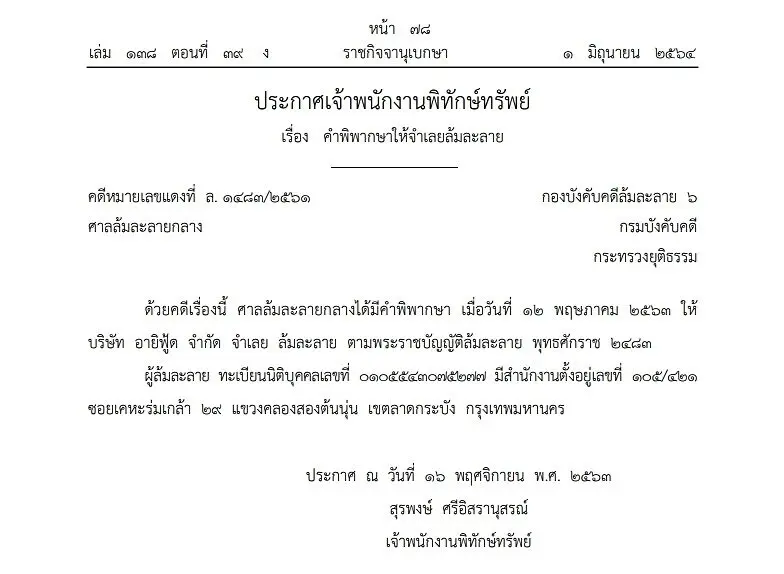 โดยประกาศฉบับดังกล่าวระบุว่า ด้วยคดีเรื่องนี้ ศาลล้มละลลายกลางได้มีคำพิพากษา เมื่อวันที่ 12 พฤษภาคม 2563 ให้บริษัท อายิฟู้ด จำกัด ล้มละลาย ตามพระราชบัญญัติล้มละลาย พ.ศ.2483