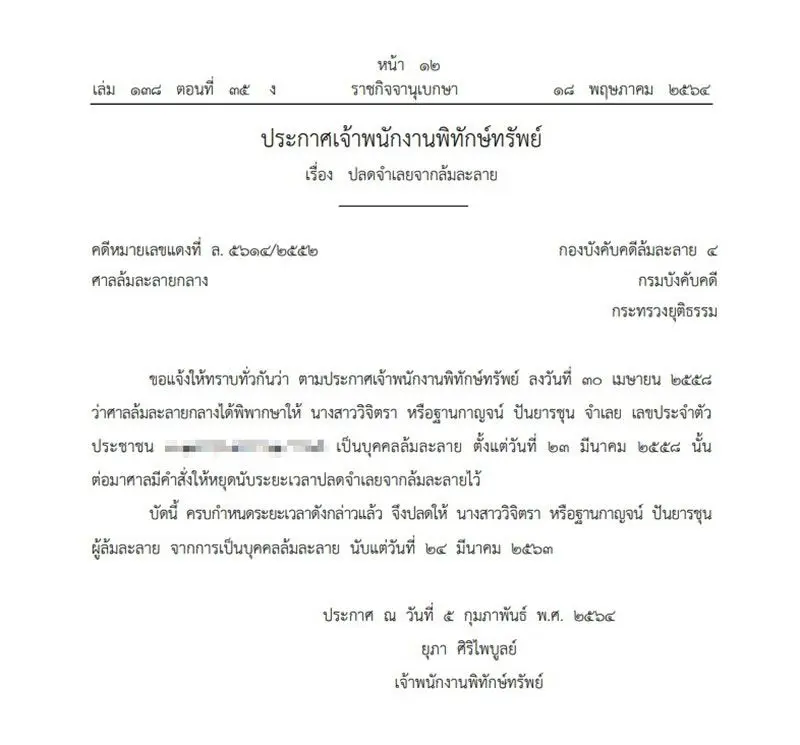 ราชกิจจานุเบกษา ประกาศปลดบุคคลนามสกุลดัง “วงษ์สุวรรณ” จากล้มละลาย