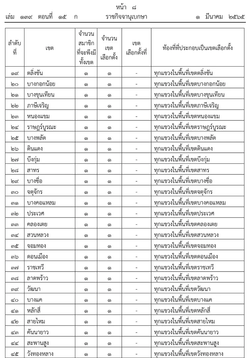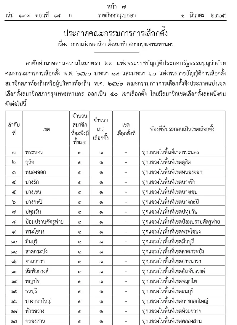 เมื่อวันที่ 1 มีนาคม 2565 เว็บไซต์ ราชกิจจานุเบกษา ได้เผยแพร่ประกาศคณะกรรมการการเลือกตั้ง เรื่อง การแบ่งเขตเลือกตั้งสมาชิกสภากรุงเทพมหานคร ความว่า