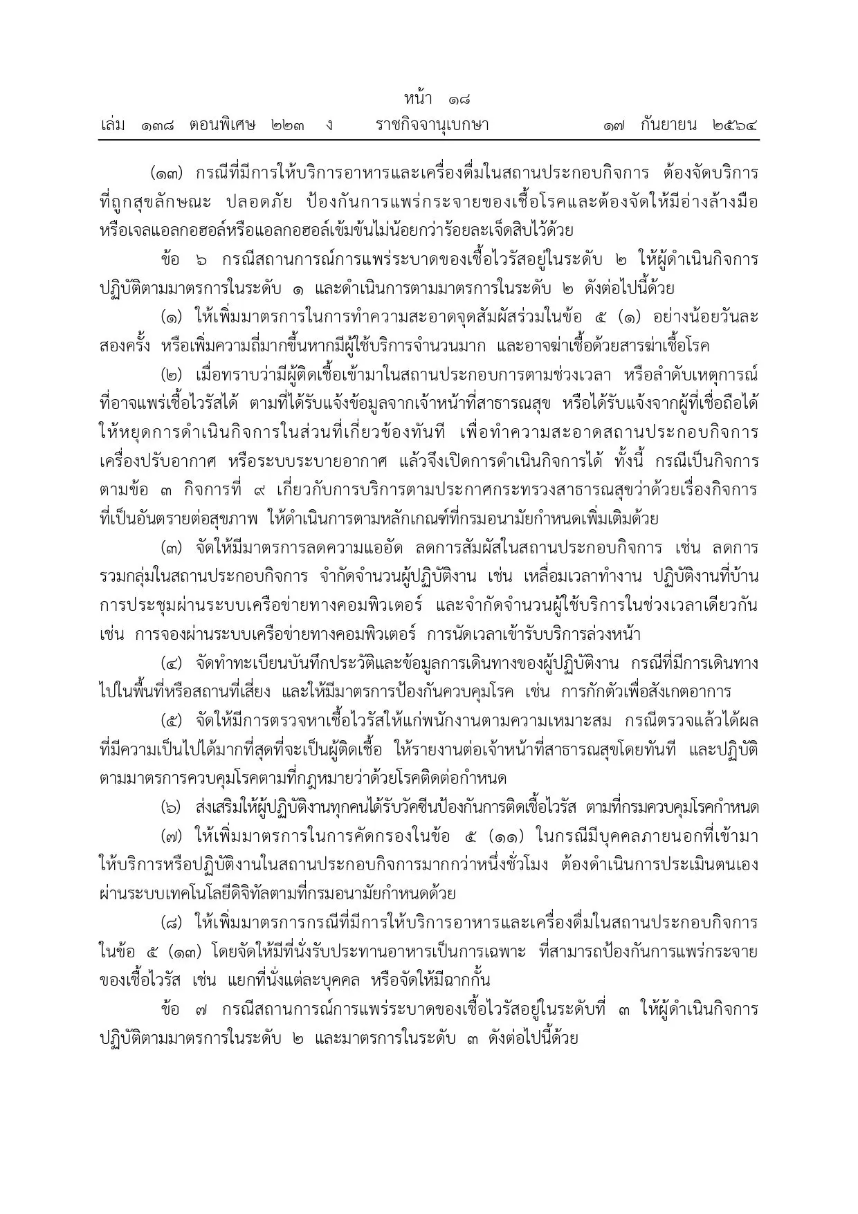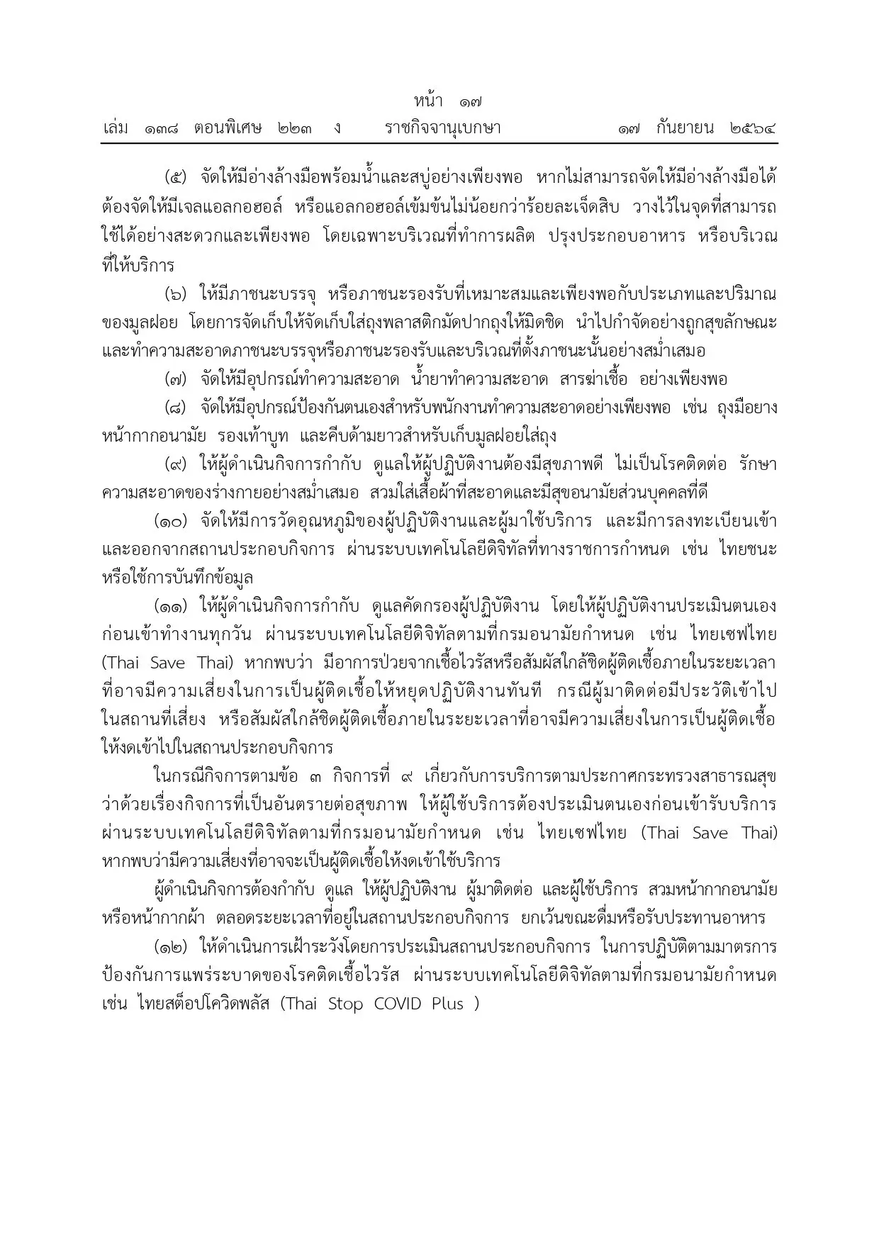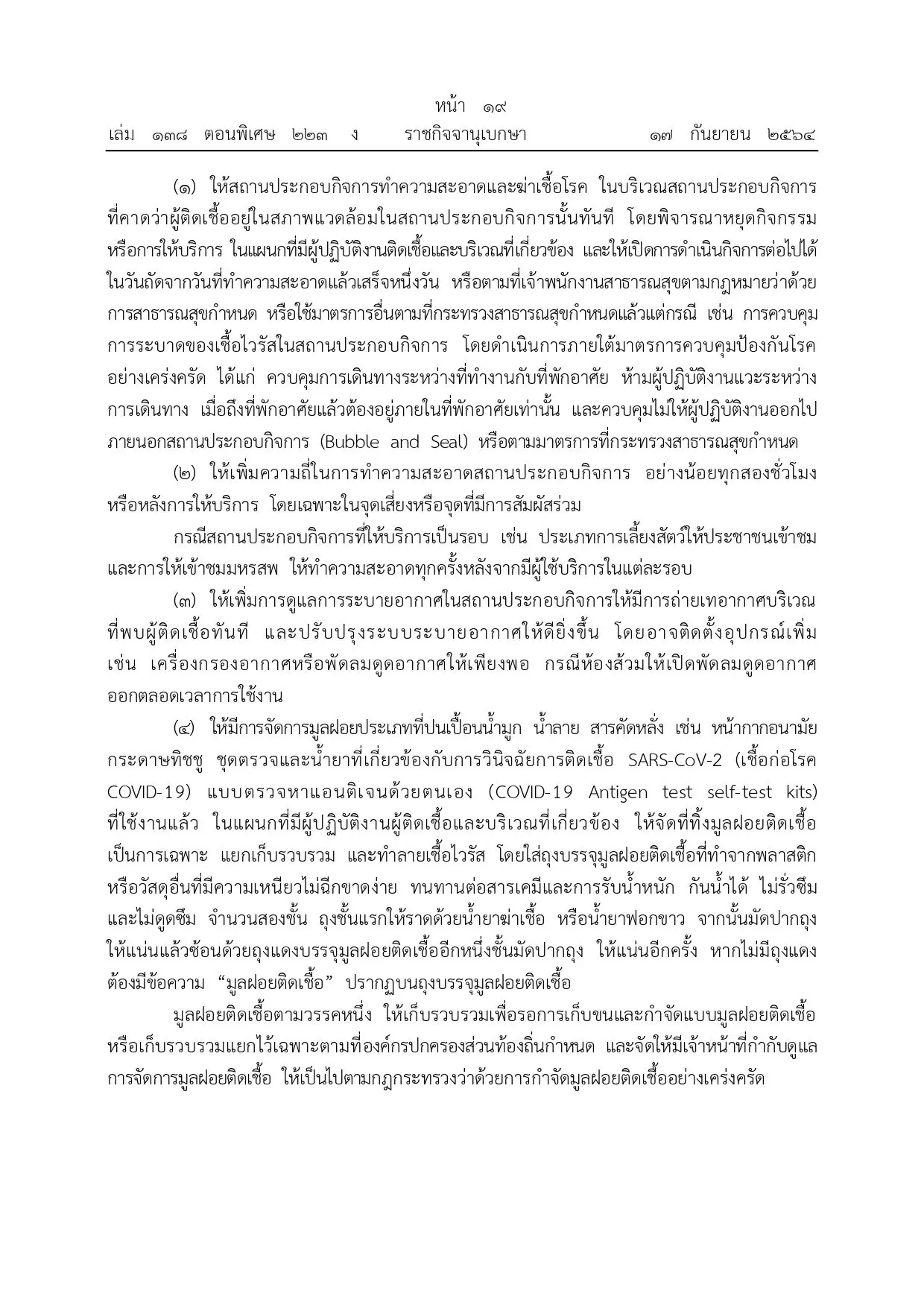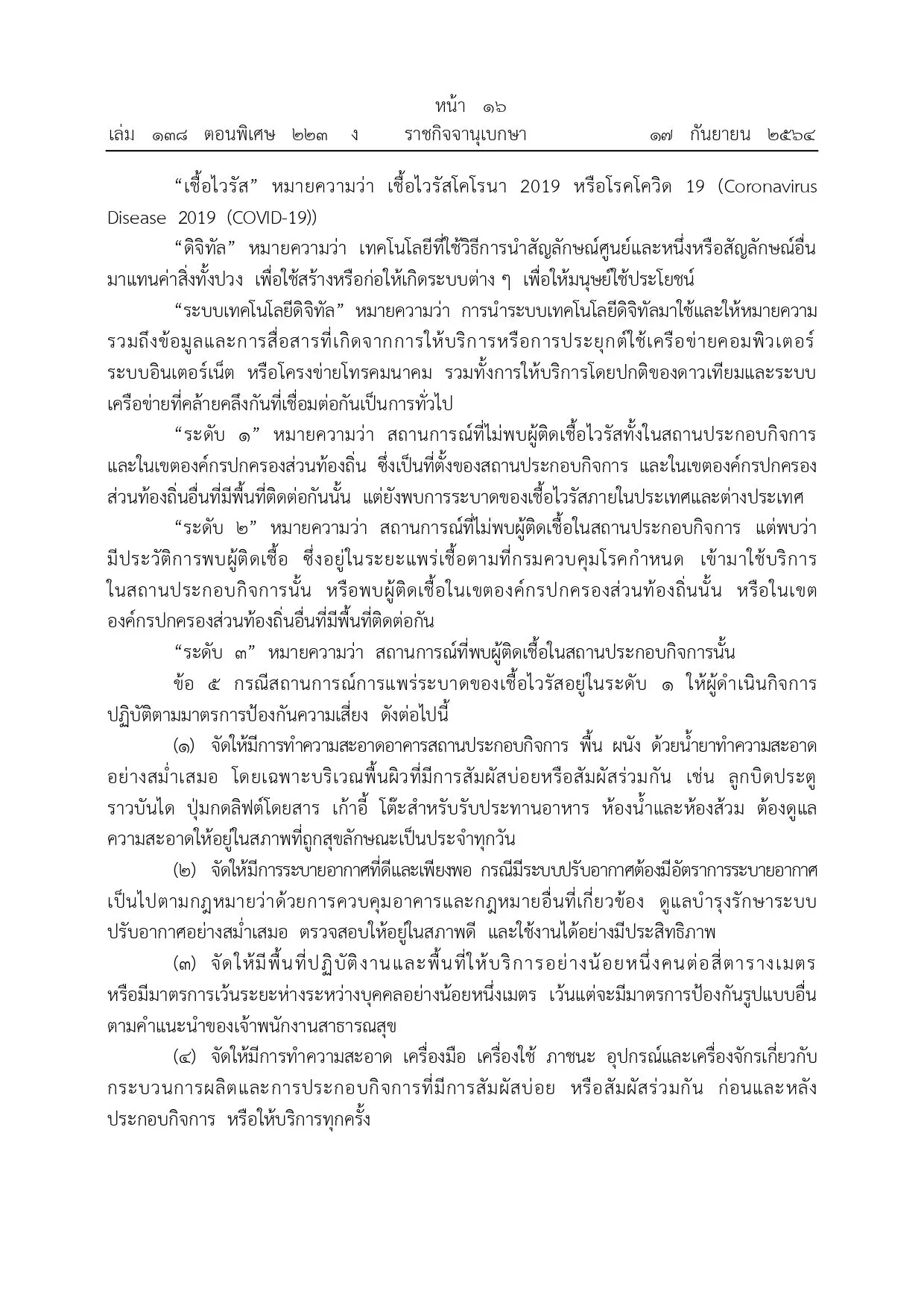 เมื่อวันที่ 17 กันยายน เว็บไซต์ ราชกิจจานุเบกษา ประกาศกระทรวงสาธารณสุข เรื่อง หลักเกณฑ์ วิธีการ และมาตรการป้องกันความเสี่ยงจากโรคติดเชื้อไวรัสโคโรนา 2019 หรือโรคโควิด 19 (Coronavirus Disease 2019 (COVID-19)) สำหรับสถานประกอบกิจการที่เป็นอันตรายต่อสุขภาพ พ.ศ. 2564 โดยมีรายละเอียดดังนี้