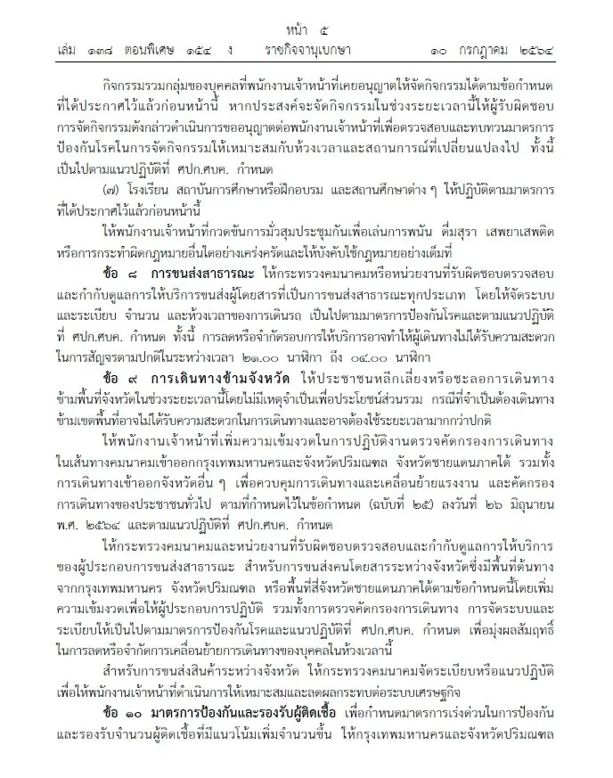 ข้อ 8 การขนส่งสาธารณะ ให้กระทรวงคมนาคมหรือหน่วยงานที่รับผิดชอบตรวจสอบและกำกับดูแลการให้บริการขนส่งผู้โดยสารที่เป็นการขนส่งสาธารณะทุกประเภท โดยให้จัดระบบและระเบียบ จำนวน และห้วงเวลาของการเดินรถ เป็นไปตามมาตรการป้องกันโรคและตามแนวปฏิบัติที่ ศปก.ศบค. กำหนด ทั้งนี้ การลดหรือจำกัดรอบการให้บริการอาจทำให้ผู้เดินทางไม่ได้รับความสะดวกในการสัญจรตามปกติในระหว่างเวลา 21.00 น. ถึง 04.00 น.