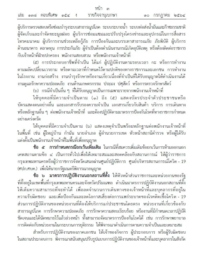 (5) การประกอบอาชีพที่จำเป็น ได้แก่ ผู้ปฏิบัติงานตามรอบเวลา กะ หรือการทำงานตามผลัดเปลี่ยนเวรยาม หรือตามเวลาที่กำหนดไว้ตามปกติของทางราชการและเอกชน การทำงานในโรงงาน งานก่อสร้าง งานบำรุงรักษาหรืองานเกี่ยวเนื่องที่จำเป็นที่ได้รับอนุญาตให้ดำเนินงานได้งานดูแลรักษาความปลอดภัย งานด้านเกษตรกรรม ประมง ปศุสัตว์ หรือการตรวจรักษาสัตว์