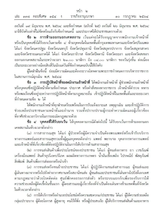 ข้อ 2 การห้ามออกนอกเคหสถาน เว้นแต่จะได้รับอนุญาตจากพนักงานเจ้าหน้าที่ หรือเป็นบุคคลซึ่งได้รับยกเว้นตามข้อ 4 ห้ามบุคคลใดในเขตพื้นที่กรุงเทพมหานครและจังหวัดปริมณฑลได้แก่ จังหวัดนครปฐม จังหวัดนนทบุรี จังหวัดปทุมธานี จังหวัดสมุทรปราการ จังหวัดสมุทรสาครและจังหวัดชายแดนภาคใต้ ได้แก่ จังหวัดนราธิวาส จังหวัดปัตตานี จังหวัดยะลา และจังหวัดสงขลาออกนอกเคหสถานในระหว่างเวลา 21.00 น. ถึง 04.00 น. ของวันรุ่งขึ้น ต่อเนื่องเป็นระยะเวลาอย่างน้อยสิบสี่วันนับแต่วันที่ข้อกำหนดฉบับนี้ใช้บังคับผู้ใดฝ่าฝืนข้อนี้ ย่อมมีความผิดและต้องระวางโทษตามพระราชกำหนดการบริหารราชการในสถานการณ์ฉุกเฉิน พ.ศ. 2548