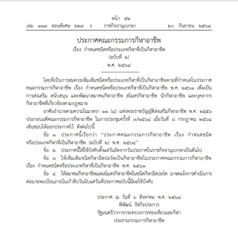เมื่อวันที่ 21 ก.ย. 2564 เว็บไซต์ ราชกิจจานุเบกษา เผยแพร่ประกาศคณะกรรมการกีฬาอาชีพ เรื่อง กำหนดชนิดหรือประเภทกีฬาที่เป็นกีฬาอาชีพ (ฉบับที่ 2) พ.ศ.2564 ระบุว่า โดยที่เป็นการสมควรเพิ่มเติมชนิดหรือประเภทกีฬาที่เป็นกีฬาอาชีพตามที่กำหนดในประกาศคณะกรรมการกีฬาอาชีพ เรื่อง กำหนดชนิดหรือประเภทกีฬาที่เป็นกีฬาอาชีพ พ.ศ.2561 เพื่อเป็นการส่งเสริม สนับสนุน และพัฒนาสมาคมกีฬาอาชีพ สโมสรกีฬาอาชีพ นักกีฬาอาชีพ และบุคลากรกีฬาอาชีพที่เกี่ยวข้องตามกฎหมาย