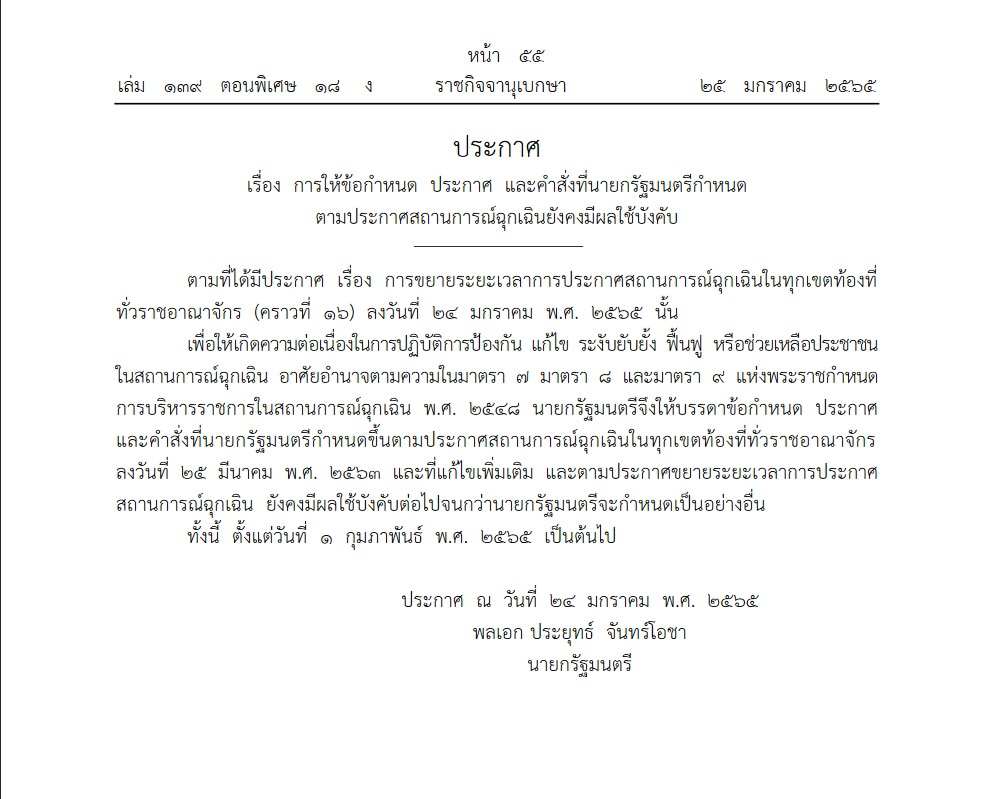 นายกรัฐมนตรีโดยความเห็นชอบของคณะรัฐมนตรีตามมติเมื่อวันที่ ๒๔ มกราคม พ.ศ. ๒๕๖๕ จึงให้ขยายระยะเวลาการประกาศสถานการณ์ฉุกเฉินในทุกเขตท้องที่ทั่วราชอาณาจักร ออกไปอีกคราวหนึ่ง