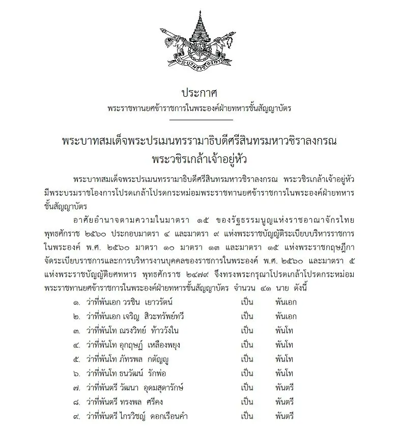 อาศัยอำนาจตามความในมาตรา 15 ของรัฐธรรมนูญแห่งราชอาณาจักรไทย พุทธศักราช 2560 ประกอบมาตรา 4 และมาตรา 9 แห่งพระราชบัญญัติระเบียบบริหารราชการ ในพระองค์ พ.ศ.2560 มาตรา 10 มาตรา 13 และมาตรา 15 แห่งพระราชกฤษฎีกา จัดระเบียบราชการและการบริหารงานบุคคลของราชการในพระองค์ พ.ศ.2560 และมาตรา 5 แห่งพระราชบัญญัติยศทหาร พุทธศักราช 2479 จึงทรงพระกรุณาโปรดเกล้าโปรดกระหม่อม พระราชทานยศข้าราชการในพระองค์ฝ่ายทหารชั้นสัญญาบัตร จำนวน 41 นาย