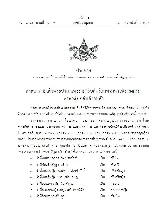 โปรดเกล้าฯ พระราชทานยศ วราภรณ์ สิริวชิรภักดิ์ เป็นพันโทหญิง และฝ่ายทหารชั้นสัญญาบัตรอีก 6 นาย