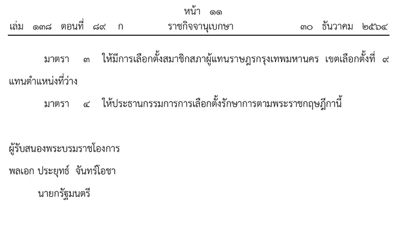 มาตรา ๓ ให้มีการเลือกตั้งสมาชิกสภาผู้แทนราษฎรกรุงเทพมหานคร เขตเลือกตั้งที่ ๙ แทนตำแหน่งที่ว่าง