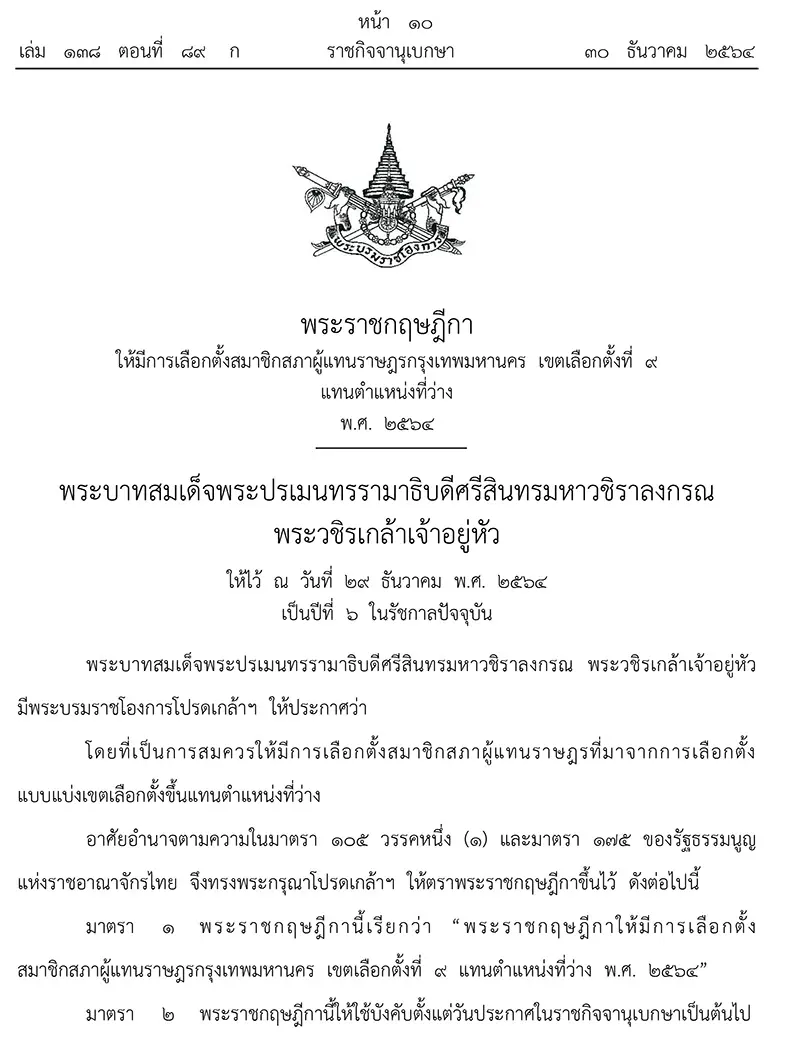 เลือกตั้งซ่อม — เมื่อวันที่ 30 ธ.ค. 2564 เว็บไซต์ราชกิจจาบุเบกษาได้ประกาศ พระราชกฤษฎีกา ให้มีการเลือกตั้งสมาชิกสภาผู้แทนราษฎรกรุงเทพมหานคร เขตเลือกตั้งที่ ๙ แทนตำแหน่งที่ว่าง พ.ศ. ๒๕๖๔