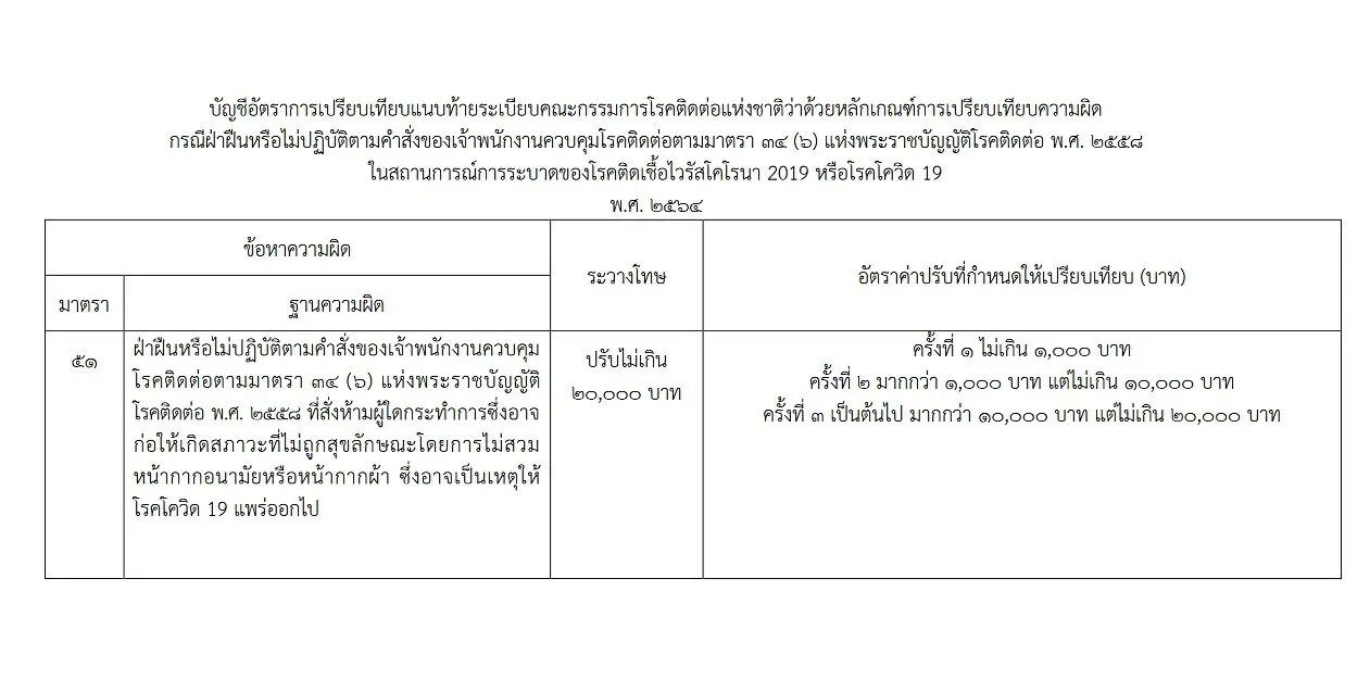 โดยบัญชีอัตราการเปรียบเทียบแนบท้ายระเบียบคณะกรรมการโรคติดต่อแห่งชาติว่าด้วยหลักเกณฑ์การเปรียบเทียบความผิด กรณีฝ่าฝืนหรือไม่ปฏิบัติตามคำสั่งของเจ้าพนักงานควบคุมโรคติดต่อตามมาตรา 34 (6) แห่งพระราชบัญญัติโรคติดต่อ พ.ศ.2558 ในสถานการณ์การระบาดของโรคติดเชื้อไวรัสโคโรนา 2019 หรือโรคโควิด-19 พ.ศ.2564