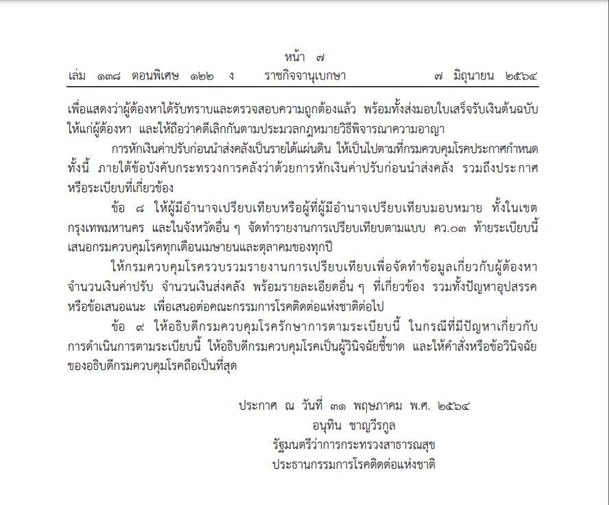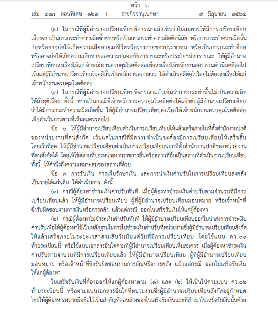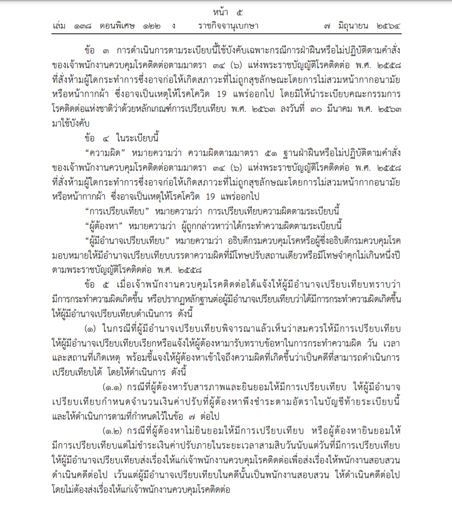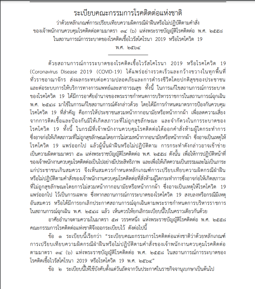 เมื่อวันที่ 7 มิถุนายน 2564 เว็บไซต์ ราชกิจจานุเบกษา เผยแพร่ระเบียบคณะกรรมการโรคติดต่อแห่งชาติว่าด้วยหลักเกณฑ์การเปรียบเทียบความผิดกรณีฝ่าฝืนหรือไม่ปฏิบัติตามคำสั่งของเจ้าพนักงานควบคุมโรคติดต่อตามมาตรา 34 (6) แห่งพระราชบัญญัติโรคติดต่อ พ.ศ.2558 ในสถานการณ์การระบาดของโรคติดเชื้อไวรัสโคโรนา 2019 หรือโรคโควิด-19 พ.ศ.2564