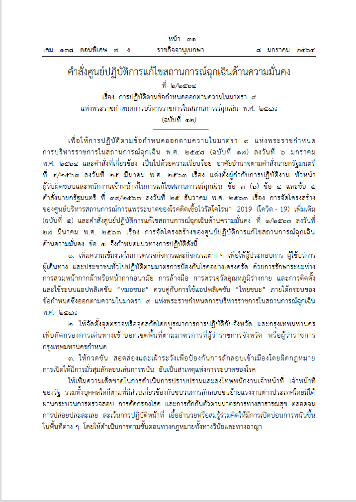 เมื่อวันที่ 8 มกราคม เว็บไซต์ ราชกิจจานุเบกษา เผยแพร่ ประกาศคำสั่งศูนย์ปฏิบัติการแก้ไขสถานการณ์ฉุกเฉินด้านความมั่นคงที่ 2/2564 เรื่องการปฏิบัติตามข้อกำหนดออกตามความในมาตรา 9 แห่งพระราชกำหนดการบริหารราชการในสถานการณ์ฉุกเฉิน พ.ศ.2548 (ฉบับที่12)
