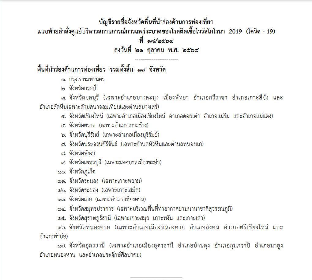 สำหรับพื้นที่นำร่องด้านการท่องเที่ยว จะเป็นไปตามบัญชีรายชื่อจังหวัดแนบท้ายคำสั่งศูนย์บริหารสถานการณ์การแพร่ระบาดของโรคติดเชื้อไวรัสโคโรนา 2019 (โควิด-19) ที่ 18/2564 เรื่อง พื้นที่นำร่องด้านการท่องเที่ยว ตามข้อกำหนดออกตามความในมาตรา 9 แห่งพระราชกำหนดการบริหารราชการในสถานการณ์ฉุกเฉิน พ.ศ. 2548 ลงวันที่ 21 ตุลาคม พ.ศ. 2564