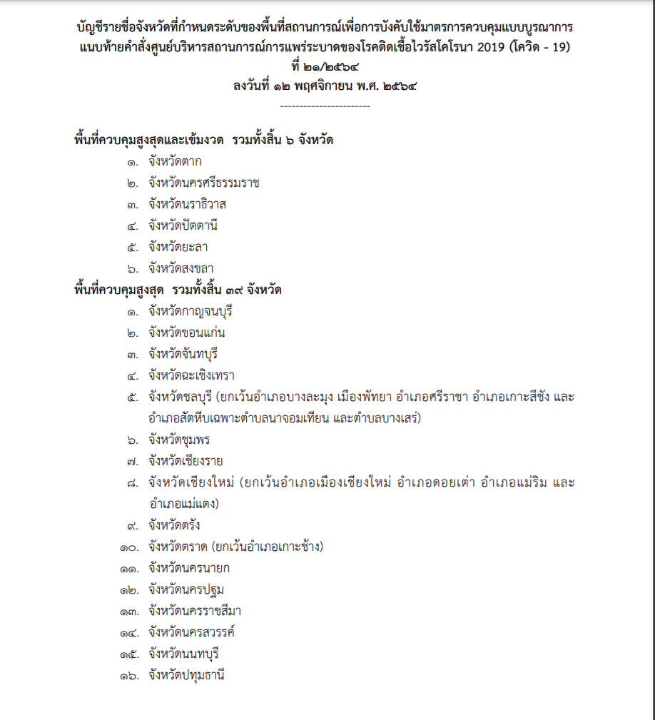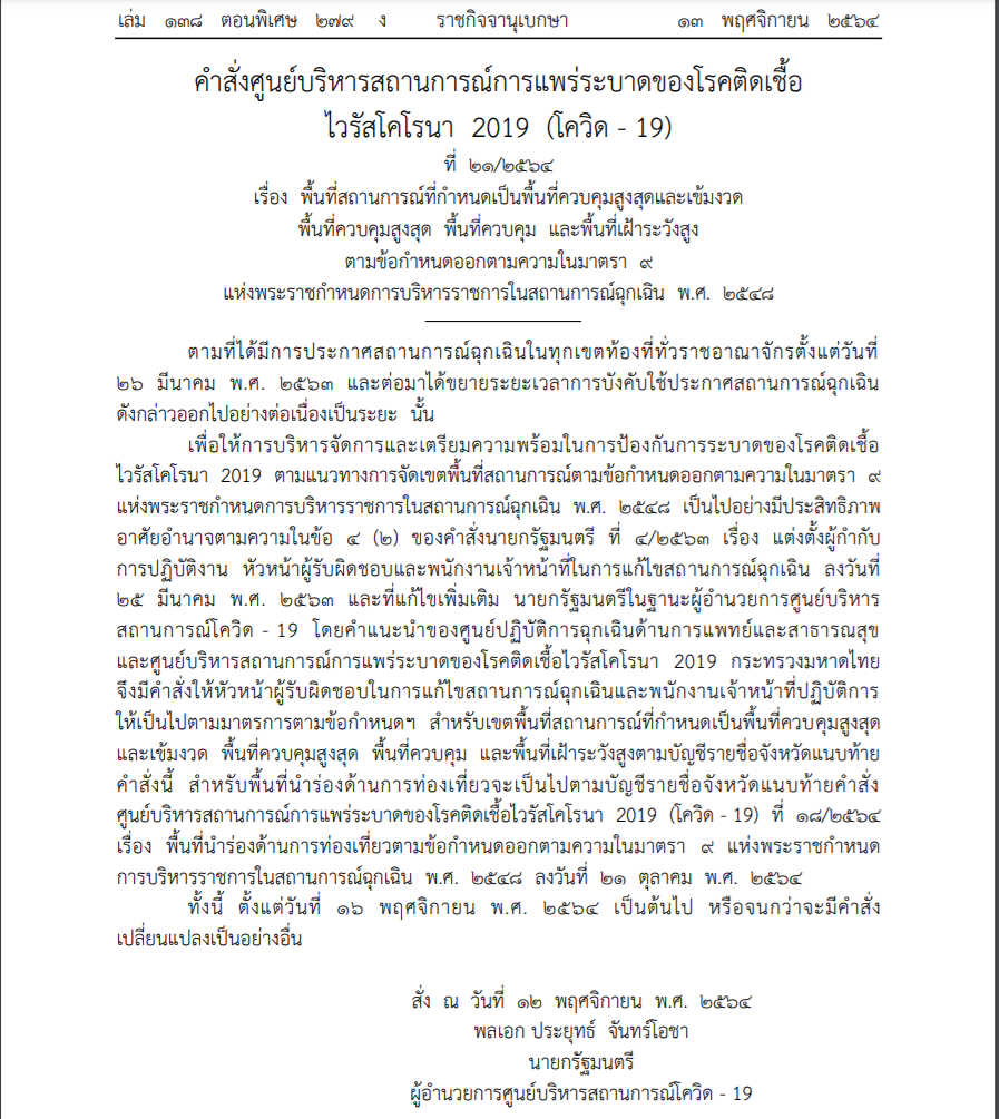 เมื่อวันที่ 13 พ.ย. 2564 ราชกิจจานุเบกษา เผยแพร่ คำสั่งศูนย์บริหารสถานการณ์การแพร่ระบาดของโรคติดเชื้อไวรัสโคโรนา 2019 (โควิด-19) ที่ 21/2564 เรื่อง พื้นที่สถานการณ์ที่กำหนดเป็นพื้นที่ควบคุมสูงสุดและเข้มงวด พื้นที่ควบคุมสูงสุด พื้นที่ควบคุม และพื้นที่เฝ้าระวังสูง ตามข้อกำหนดออกตามความในมาตรา 9 แห่งพระราชกำหนดการบริหารราชการในสถานการณ์ฉุกเฉิน พ.ศ. 2548 โดย พลเอกประยุทธ์ จันทร์โอชา นายกรัฐมนตรี ในฐานะผู้อำนวยการศูนย์บริหารสถานการณ์โควิด-19 สั่ง ณ วันที่ 12 พฤศจิกายน พ.ศ. 2564 มีเนื้อหาระบุว่า