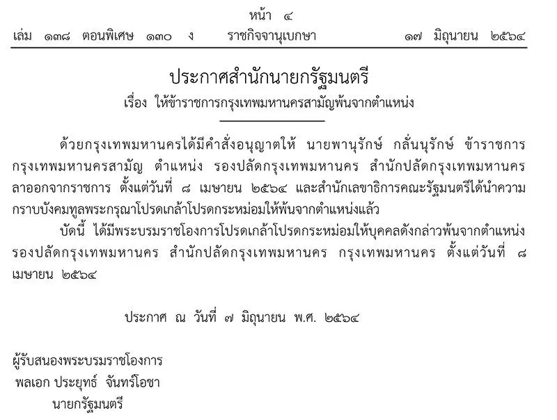 พานุรักษ์ กลั่นนุรักษ์ —- เมื่อวันที่ 17 มิถุนายน ราชกิจจานุเบกษาเผยแพร่ประกาศสำนักนายกรัฐมนตรีเรื่อง ให้ข้าราชการกรุงเทพมหานครสามัญพ้นจากตำแหน่ง ด้วยกรุงเทพมหานครได้มีคำสั่งอนุญาตให้ นายพานุรักษ์ กลั่นนุรักษ์ ข้าราชการกรุงเทพมหานครสามัญ ตำแหน่ง รองปลัดกรุงเทพมหานคร สำนักปลัดกรุงเทพมหานคร ลาออกจากราชการ ตั้งแต่วันที่ 8 เมษายน 2564 และสำนักเลขาธิการคณะรัฐมนตรีได้นำความกราบบังคมทูลพระกรุณาโปรดเกล้าโปรดกระหม่อมให้พ้นจากตำแหน่งแล้ว