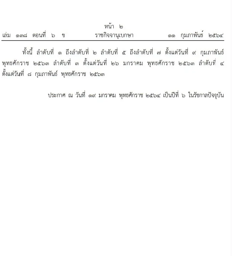 ทั้งนี้ ลำดับที่ 1 ถึงลำดับที่ 2 ลำดับที่ 5 ถึงลำดับที่ 7 ตั้งแต่วันที่ 9 กุมภาพันธ์ พุทธศักราช 2563 ลำดับที่ 3 ตั้งแต่วันที่ 26 มกราคม พุทธศักราช 2563 ลำดับที่ 4 ตั้งแต่วันที่ 8 กุมภาพันธ์ พุทธศักราช 2563
