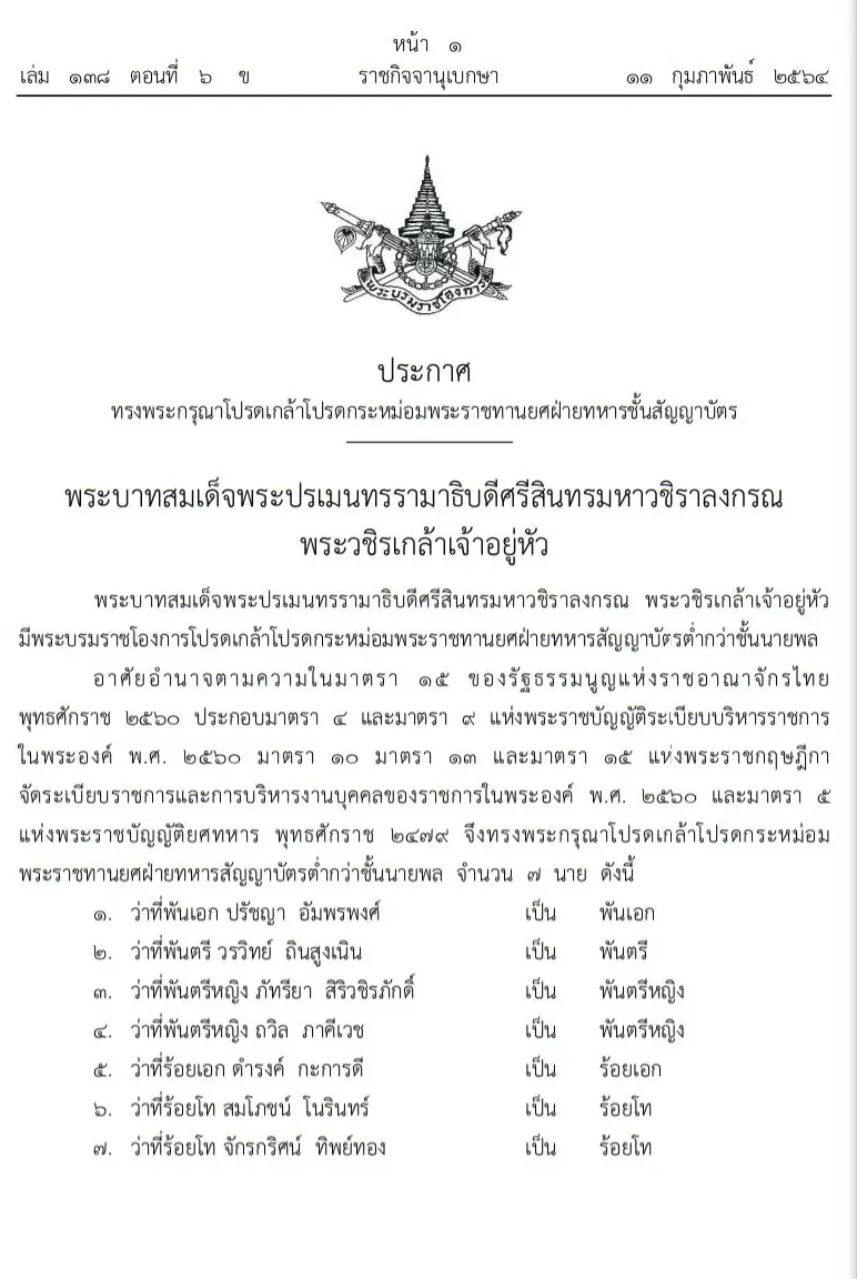 โปรดเกล้าฯ พระราชทานยศ วราภรณ์ สิริวชิรภักดิ์ เป็นพันโทหญิง และฝ่ายทหารชั้นสัญญาบัตรอีก 6 นาย