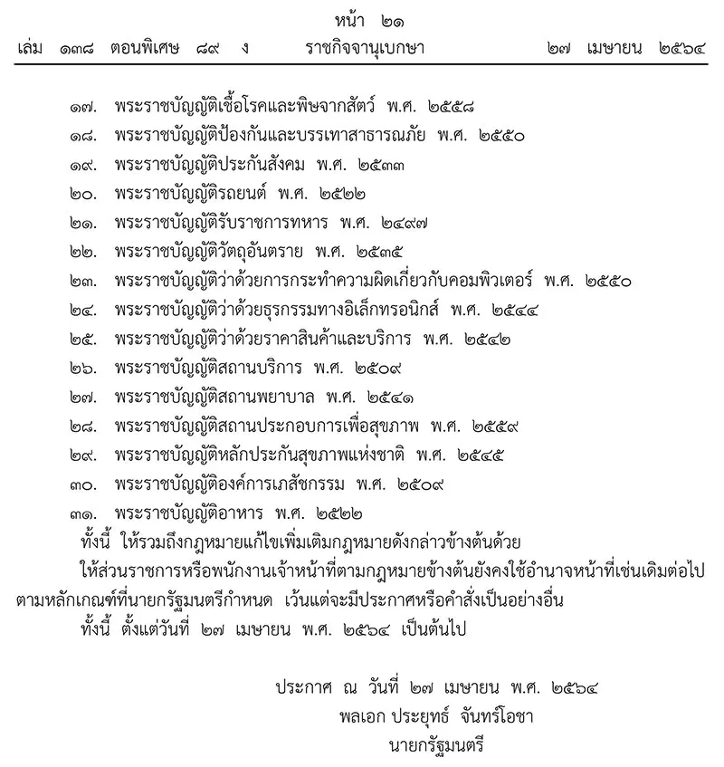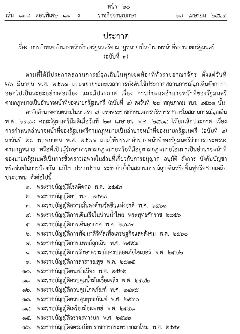 อาศัยอำนาจตามความในมาตรา 7 แห่งพระราชกำหนดการบริหารราชการในสถานการณ์ฉุกเฉิน พ.ศ.2548 คณะรัฐมนตรีมีมติเมื่อวันที่ 27 เม.ย.2564 ให้ยกเลิกประกาศ เรื่อง การกำหนดอำนาจหน้าที่ของรัฐมนตรีตามกฎหมายเป็นอำนาจหน้าที่ของนายกรัฐมนตรี (ฉบับที่ 2) ลงวันที่ 26 พ.ค.2563 และให้บรรดาอำนาจหน้าที่ของรัฐมนตรีว่าการกระทรวงตามกฎหมาย หรือที่เป็นผู้รักษาการตามกฎหมายหรือที่มีอยู่ตามกฎหมายโอนมาเป็นอำนาจหน้าที่ของนายกรัฐมนตรีเป็นการชั่วคราวเฉพาะในส่วนที่เกี่ยวกับการอนุญาต อนุมัติ สั่งการ บังคับบัญชา หรือช่วยในการป้องกัน แก้ไข ปราบปราม ระงับยับยั้งในสถานการณ์ฉุกเฉินหรือฟื้นฟูหรือช่วยเหลือประชาชน ดังต่อไปนี้