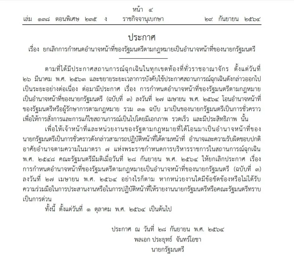 เมื่อวันที่ 29 ก.ย.เว็บไซต์ ราชกิจจานุเบกษา เผยแพร่ ประกาศเรื่องยกเลิกกำหนดการอำนาจหน้าที่ของรัฐมนตรีตามกฎหมาย เป็นอำนาจหน้าที่ของนายกรัฐมนตรี มีเนื้อความระบุว่าตามที่ได้มีประกาศสถานการณ์ฉุกเฉินในทุกเขตท้องที่ทั่วราชอาณาจักร ตั้งแต่วันที่ 26 มีนาคม พ.ศ.2563 และขยายระยะเวลาการบังคับใช้ประกาศสถานการณ์ฉุกเฉินดังกล่าวออกไป เป็นระยะอย่างต่อเนื่อง ต่อมามีประกาศ เรื่อง การกำหนดอำนาจหน้าที่ของรัฐมนตรีตามกฎหมาย เป็นอำนาจหน้าที่ของนายกรัฐมนตรี (ฉบับที่ 3) ลงวันที่ 27 เมษายน พ.ศ.2564 โอนอำนาจหน้าที่ของรัฐมนตรีหรือผู้รักษาการตามกฎหมาย รวม 31 ฉบับ มาเป็นของนายกรัฐมนตรีเป็นการชั่วคราว เพื่อให้การสั่งการและการแก้ไขสถานการณ์เป็นไปโดยมีเอกภาพ รวดเร็ว และมีประสิทธิภาพ นั้น