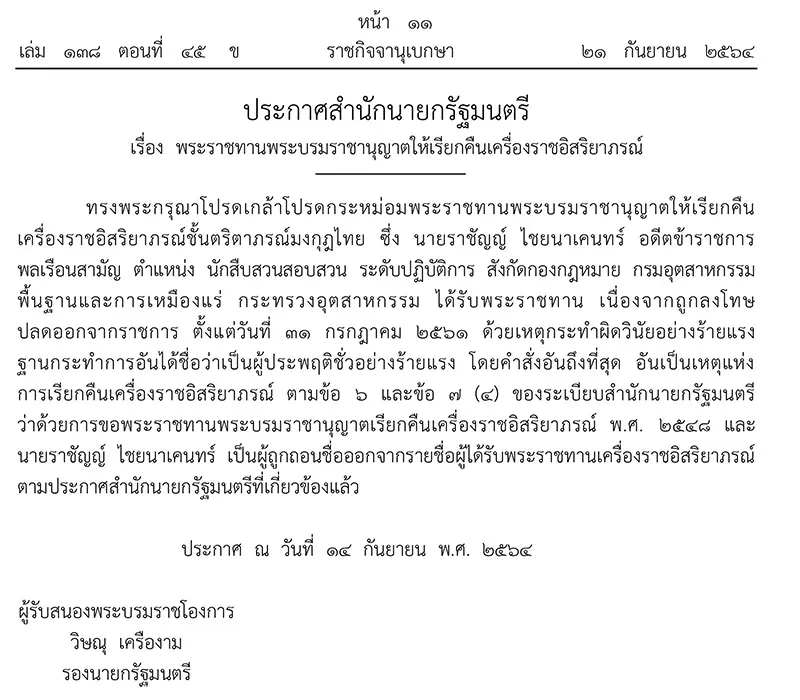 ประกาศสำนักนายกรัฐมนตรี เรื่อง พระราชทานพระบรมราชานุญาตให้เรียกคืนเครื่องราชอิสริยาภรณ์ โดยมี นายวิษณุ เครืองาม รองนายกรัฐมนตรี เป็นผู้รับสนองพระบรมราชโองการ ซึ่งมีเนื้อหาระบุว่า