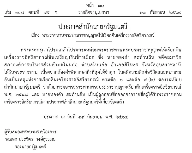 ทรงพระกรุณาโปรดเกล้าโปรดกระหม่อมพระราชทานพระบรมราชานุญาตให้เรียกคืนเครื่องราชอิสริยาภรณ์ชั้นเหรียญเงินช้างเผือก ซึ่ง นายทองดำ สะท้านถิ่น อดีตสมาชิกสภาองค์การบริหารส่วนตำบลโนนก่อ ตำบลโนนก่อ อำเภอสิรินธร จังหวัดอุบลราชธานี ได้รับพระราชทาน เนื่องจากต้องคำพิพากษาถึงที่สุดให้จำคุก ในคดีความผิดต่อชีวิตและพยายาม อันเป็นเหตุแห่งการเรียกคืนเครื่องราชอิสริยาภรณ์ ตามข้อ 6 และข้อ 7 (2) ของระเบียบสำนักนายกรัฐมนตรี ว่าด้วยการขอพระราชทานพระบรมราชานุญาตเรียกคืนเครื่องราชอิสริยาภรณ์ พ.ศ. 2548 และ นายทองดำ สะท้านถิ่น เป็นผู้ถูกถอนชื่อออกจากรายชื่อผู้ได้รับพระราชทานเครื่องราชอิสริยาภรณ์ตามประกาศสำนักนายกรัฐมนตรีที่เกี่ยวข้องแล้ว ประกาศ ณ วันที่ 14 กันยายน พ.ศ. 2564
