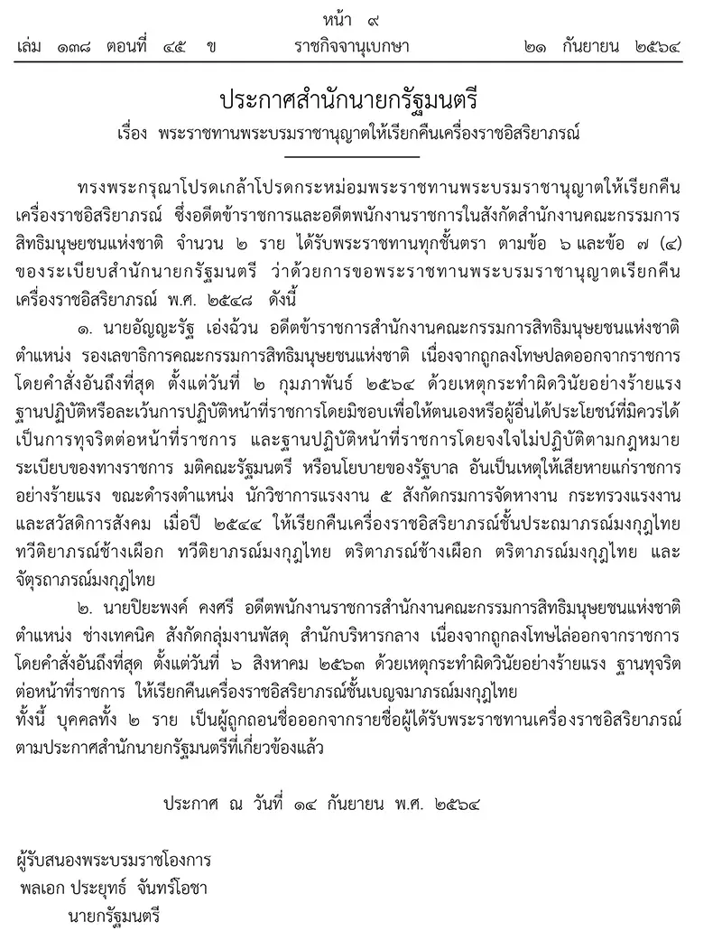 1. นายอัญญะรัฐ เอ่งฉ้วน อดีตข้าราชการสำนักงานคณะกรรมการสิทธิมนุษยชนแห่งชาติ ตำแหน่ง รองเลขาธิการคณะกรรมการสิทธิมนุษยชนแห่งชาติ เนื่องจากถูกลงโทษปลดออกจากราชการโดยคำสั่งอันถึงที่สุด ตั้งแต่วันที่ 6 กุมภาพันธ์ 2564 ด้วยเหตุกระทำผิดวินัยอย่างร้ายแรงฐานปฏิบัติหรือละเว้นการปฏิบัติหน้าที่ราชการโดยมิชอบเพื่อให้ตนเองหรือผู้อื่นได้ประโยชน์ที่มิควรได้เป็นการทุจริตต่อหน้าที่ราชการ และฐานปฏิบัติหน้าที่ราชการโดยจงใจไม่ปฏิบัติตามกฎหมายระเบียบของทางราชการ มติคณะรัฐมนตรี หรือนโยบายของรัฐบาล อันเป็นเหตุให้เสียหายแก่ราชการอย่างร้ายแรง ขณะดำรงตำแหน่ง นักวิชาการแรงงาน 5 สังกัดกรมการจัดหางาน กระทรวงแรงงานและสวัสดิการสังคม เมื่อปี 2544 ให้เรียกคืนเครื่องราชอิสริยาภรณ์ชั้นประถมาภรณ์มงกุฎไทยทวีติยาภรณ์ช้างเผือก ทวีติยาภรณ์มงกุฎไทย ตริตาภรณ์ช้างเผือก ตริตาภรณ์มงกุฎไทย และจัตุรถาภรณ์มงกุฎไทย