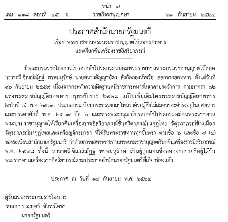 ถอดยศทหาร — เมื่อวันที่ 21 ก.ย. 2564 เว็บไซต์ ราชกิจจานุเบกษา เผยแพร่ประกาศสำนักนายกรัฐมนตรี ที่คล้ายคลึงกัน 4 ฉบับ เรื่อง พระราชทานพระบรมราชานุญาตให้ถอดยศทหารและเรียกคืนเครื่องราชอิสริยาภรณ์ และเรื่อง พระราชทานพระบรมราชานุญาตให้เรียกคืนเครื่องราชอิสริยาภรณ์ ดังนี้