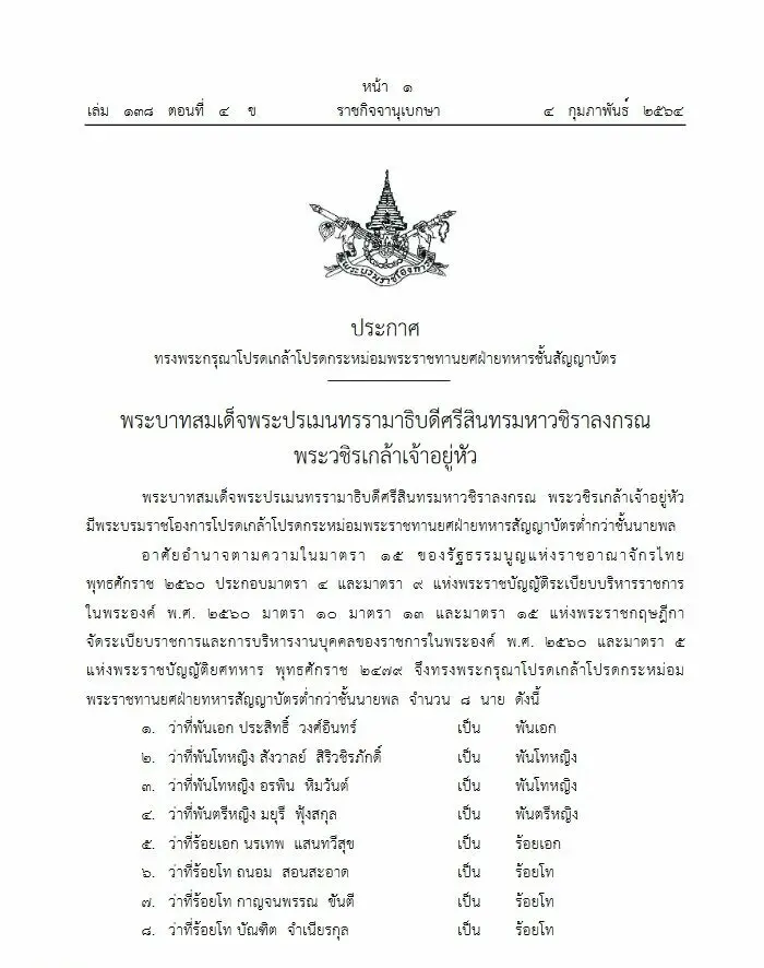 สังวาลย์ สิริวชิรภักดิ์ —- เมื่อวันที่ 4 กุมภาพันธ์ เว็บไซต์ราชกิจจานุเบกษา เผยแพร่ประกาศทรงพระกรุณาโปรดเกล้าโปรดกระหม่อมพระราชทานยศฝ่ายทหารชั้นสัญญาบัตร ความว่า พระบาทสมเด็จพระปรเมนทรรามาธิบดีศรีสินทรมหาวชิราลงกรณ พระวชิรเกล้าเจ้าอยู่หัว มีพระบรมราชโองการโปรดเกล้าโปรดกระหม่อมพระราชทานยศฝ่ายทหารสัญญาบัตรต่ำกว่าชั้นนายพล