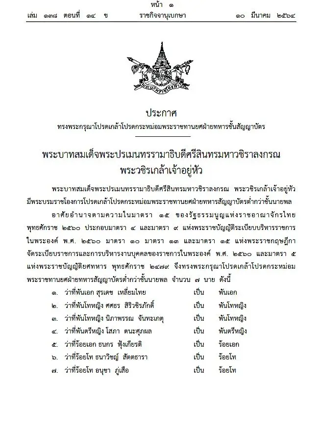 โปรดเกล้าฯ พระราชทานยศ อนุสรา สิริวชิรภักดิ์ เป็นพันตรีหญิง และนายทหารอีก 6 นาย