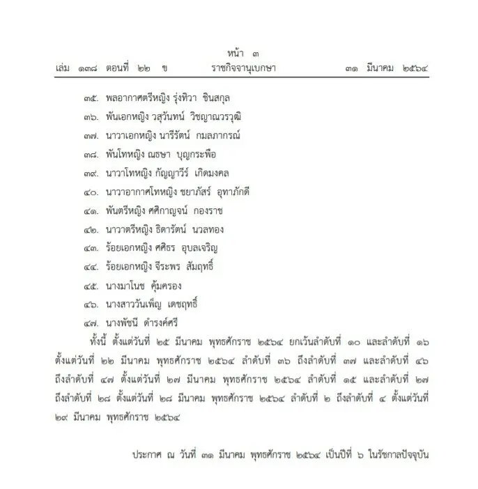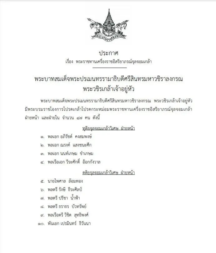 สุทัตตาภักดิ์ บริรักษ์ภูมินทร์ — เมื่อวันที่ 31 มีนาคม เว็บไซต์ราชกิจจานุเบกษา ได้เผยแพร่ประกาศ เรื่อง พระราชทานเครื่องราชอิสริยาภรณ์จุลจอมเจ้า ความว่า พระบาทสมเด็จพระปรเมนทรรามาธิบดีศรีสินทรมหาวชิราลงกรณ พระวชิรเกล้าเจ้าอยู่หัว มีพระบรมราชโองการโปรดเกล้าโปรดกระหม่อมพระราชทานเครื่องราชอิสริยาภรณ์จุลจอมเกล้าฝ่ายหน้าและฝ่ายใน จำนวน 47 คน ดังนี้