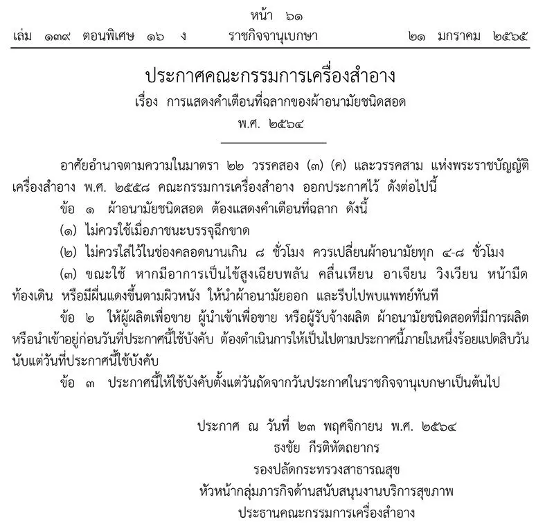 ผ้าอนามัยชนิดสอด — เมื่อวันที่ 22 มกราคม 2565 เว็บไซต์ราชกิจจานุเบกษา เผยแพร่ประกาศคณะกรรมการเครื่องสำอางเรื่อง การแสดงคำเตือนที่ฉลากของผ้าอนามัยชนิดสอด พ.ศ. ๒๕๖๔
