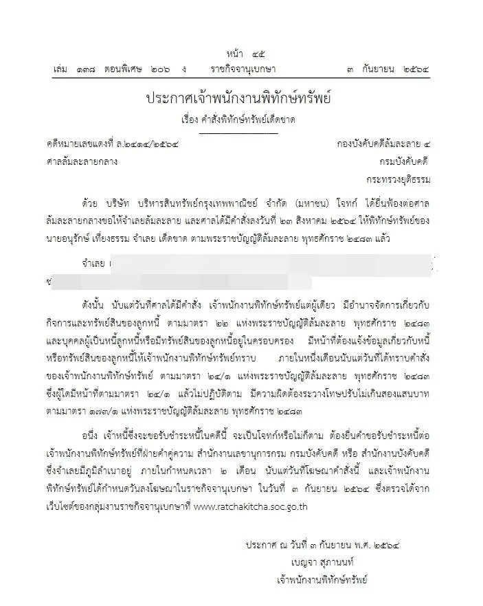 ราชกิจจานุเบกษา เผยแพร่ประกาศให้ 2 บุคคลนามสกุลดัง ดามาพงษ์ ล้มละลาย