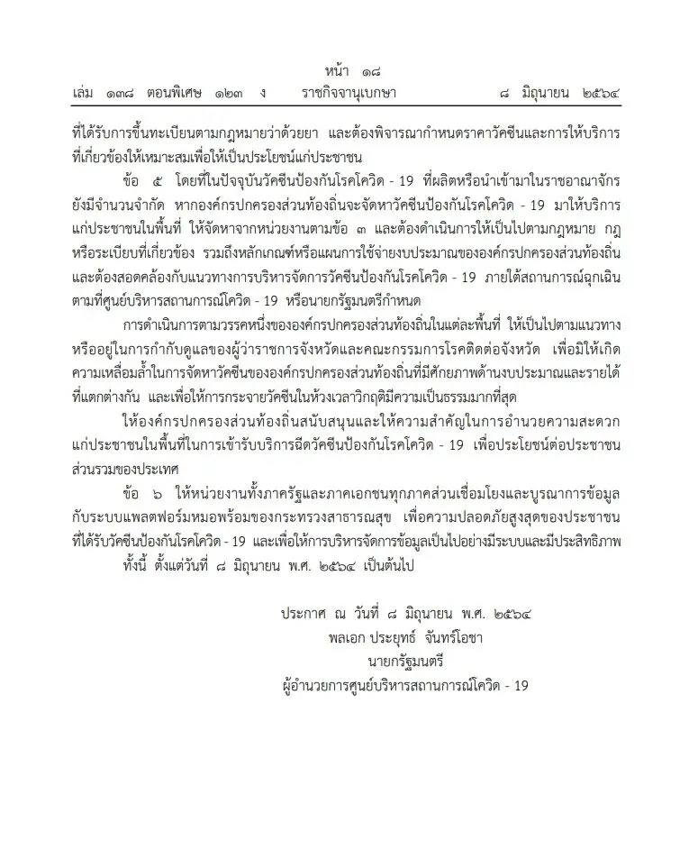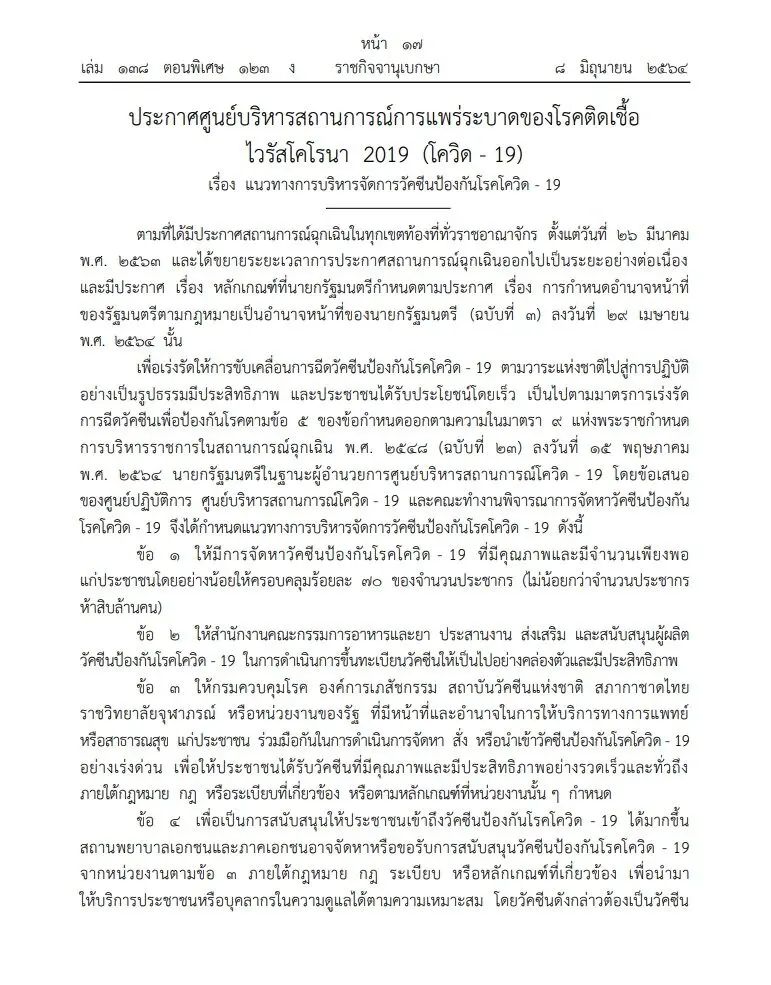 เมื่อวันที่ 8 มิถุนายน 2564 เว็บไซต์ ราชกิจจานุเบกษา เผยแพร่ประกาศศูนย์บริหารสถานการณ์การแพร่ระบาดของโรคติดเชื้อไวรัสโคโรนา 2019 (โควิด – 19) เรื่อง แนวทางการบริหารจัดการวัคซีนป้องกันโรคโควิด-19